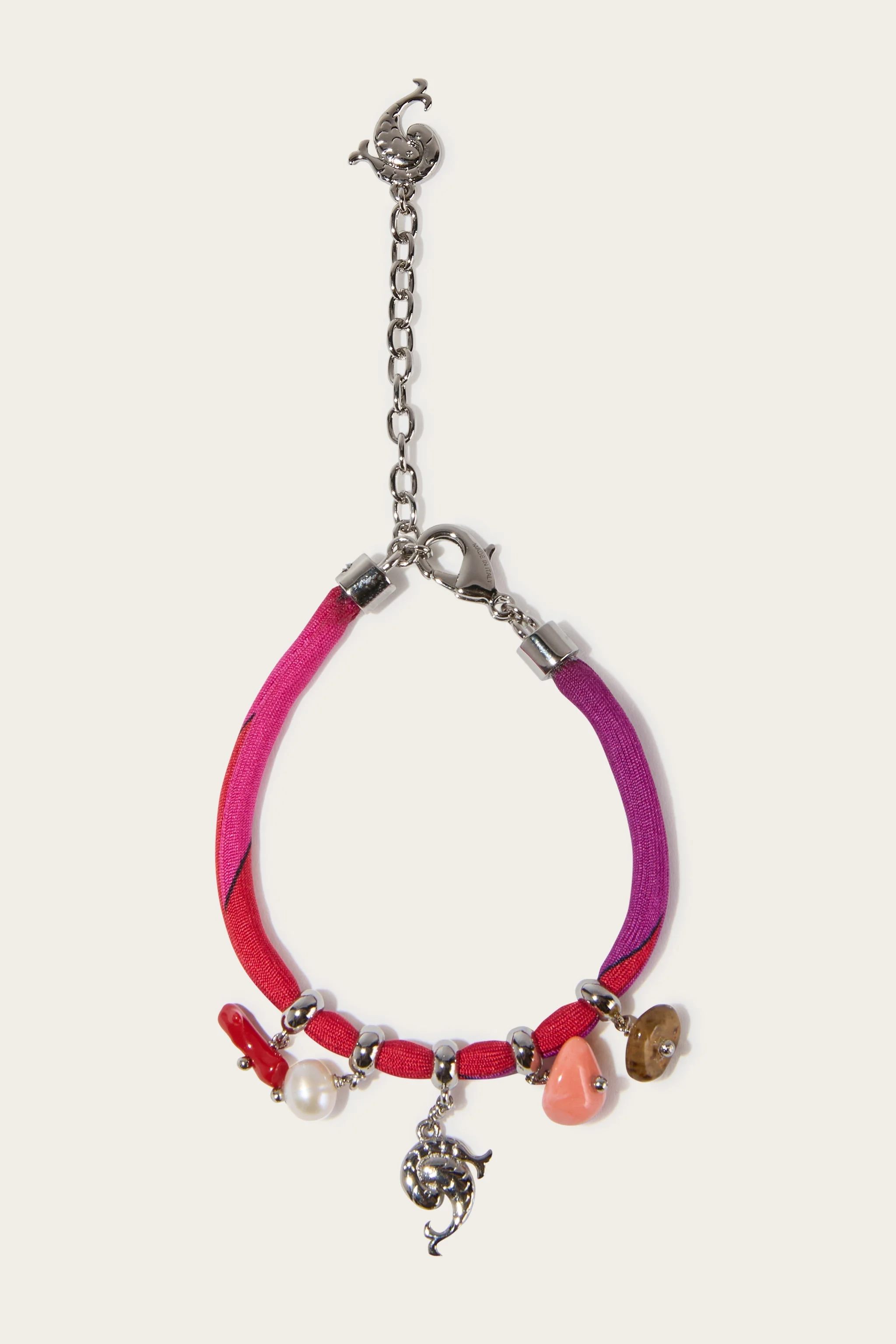 A fine accessory that celebrates the art of detail. This printed silk tubular bracelet, with its vibrant red color and marine-inspired charms, is a versatile and distinctive piece of jewelry. The colorful beads and natural baroque pearl add a touch of elegance, while the small Pesci recalls Pucci heritage. Perfect for enriching everyday looks or adding a colorful accent to an evening outfit. - Red - 4mm printed silk tube - Dangling colorful beads, natural baroque pearl and fish pendant - Adjustable hook with polished palladium metal fish detail - ID: 5HAB025H761006