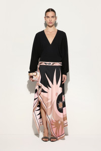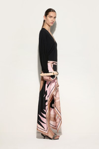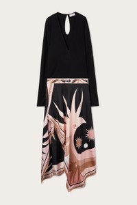 A dress that captures timeless elegance with a dynamic twist. The cape sleeves add movement and give an extremely refined effect to the outfit, which becomes perfect for special occasions or elegant evenings.The Stella print, which originated as an archival scarf in 1970, adds a unique touch to the design: an explosion of colors and circular shapes that evoke Stellas in the sky, celebrating a galaxy full of life. The asymmetric hemline completes the look, making this dress a true masterpiece of Pucci style and craftsmanship. - Nude - Viscose jersey - Long cape sleeves - Asymmetrical hem - Stella print - ID: 5HJI555H626999 - The model is 178 cm tall and wears a 38 italian size.