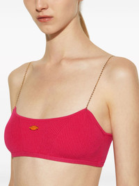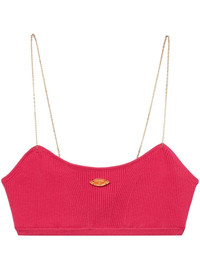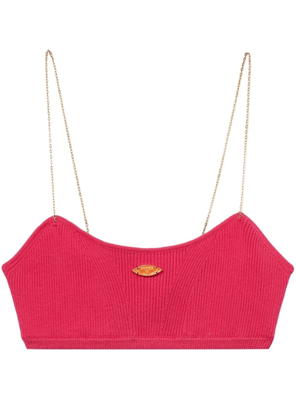 chain-strap ribbed bandeau top Crafted to a ribbed knit, this raspberry-pink PUCCI bandeau top is held in place by two dainty chain-link shoulder straps rendered in a golden hue. It's finished with an enamel logo plaque at the chest, acting as a branded note. Highlights - Raspberry pink - Ribbed knit - Logo plaque - Gold-tone hardware - Square neck - Two chain-link shoulder straps - Straight hem - Cropped Made in Italy Composition Viscose 70%, Polyester 30%
