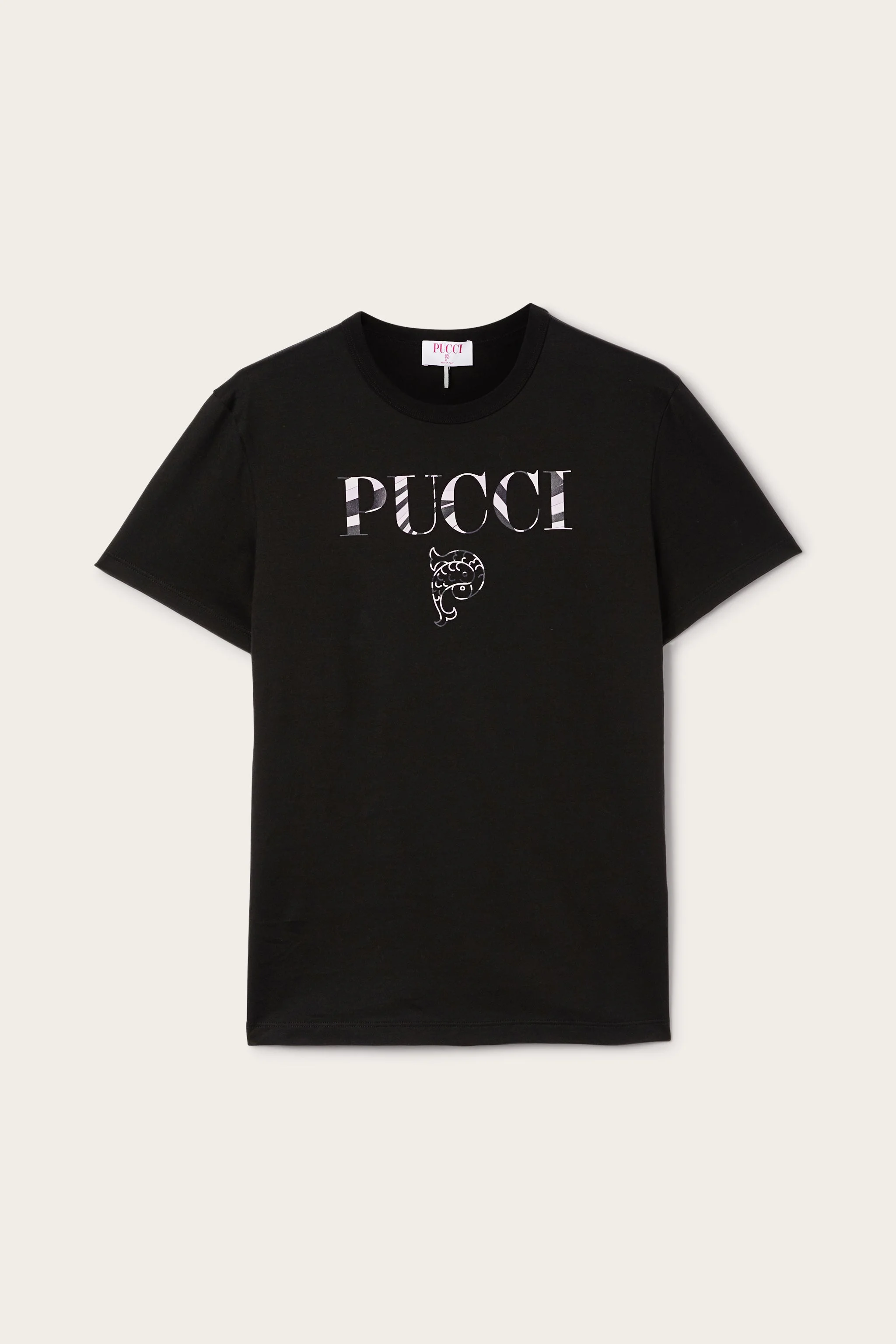 Clean lines and iconic style for this pure cotton T-shirt. The combed and twisted yarn gives a slightly crinkled texture, enhancing the simplicity of the design with a sophisticated touch. The Pucci logo on the front adds a distinctive accent to this versatile everyday garment. - Black - 100% cotton - Round neck - Short sleeves - Pucci logo on the chest - Regular fit - Hand wash - Made in Italy - ID: 5UTP755U983999