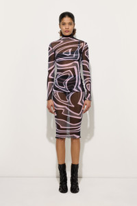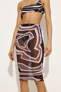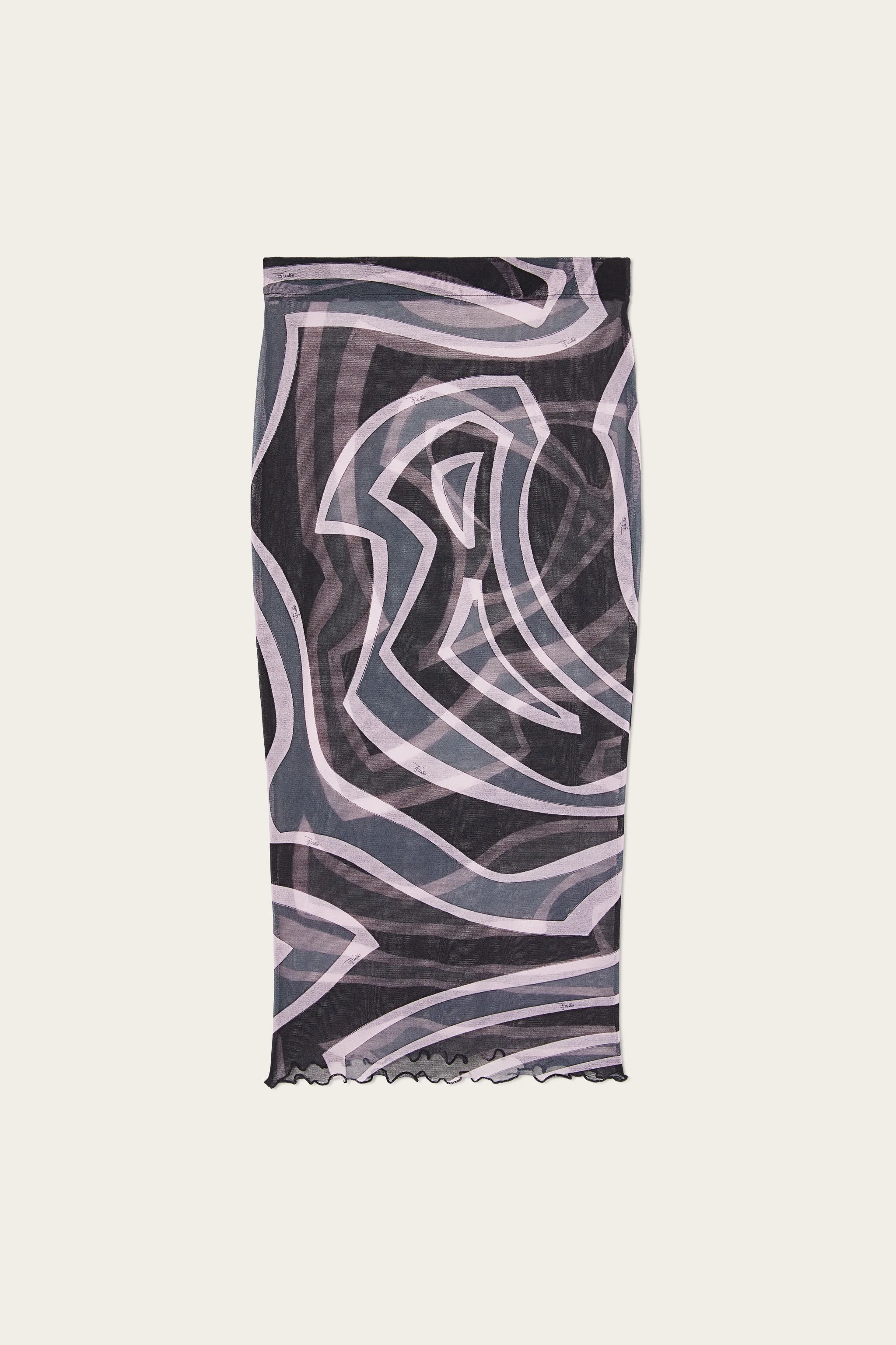 Delicate, graphic elegance defines this fitted midi skirt. The lightweight stretch tulle molds to the body like a second skin, while the Labirinto print—a reinterpretation of a 1969 archive design—adds a touch of mystery and visual appeal. Perfect for pairing with matching tops or neutral pieces for a bold contrast. - To offer you a unique Pucci garment, we use an all-over print that makes the product unrepeatable. Therefore, the pattern print may vary from the one displayed in the photo. - Black and Pink - Lightweight stretch tulle - 94% polyamide, 6% elastane - Labirinto all-over print - Midi length - Fitted fit - Soft to the touch, second-skin effect - Delicate dry clean - Made in Italy - ID: 5UJV105U749047