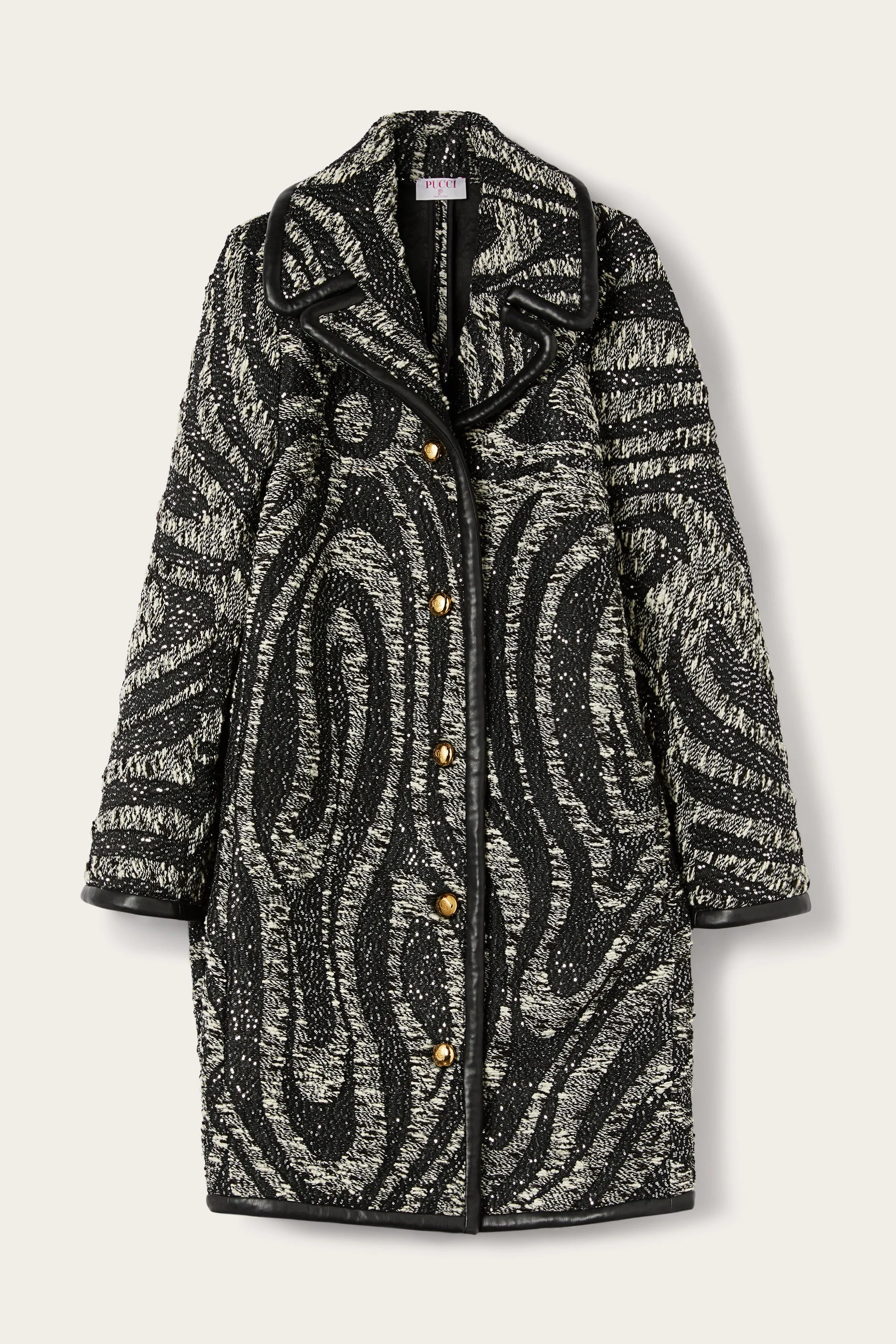 Tailored elegance meets the vibrant spirit of Pucci in this knee-length coat crafted from an exclusive tweed fabric. Multicolored yarns are interwoven with a custom-made sequin thread, creating a sparkling reinterpretation of the iconic Marmo motif. The button closure, open lapel collar, and front pockets complete the design with a classic, feminine touch. - To offer you a unique Pucci garment, we use an all-over print that makes the product unrepeatable. Therefore, the pattern print may vary from the one displayed in the photo. - Black and Multicolor - Tweed with Marmo pattern and sequin thread - Front button closure - Knee length - Open lapel collar - Two front patch pockets - Dry clean only - Made in Italy - ID: 5URA555U701J70