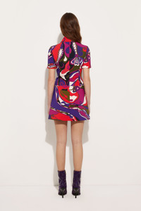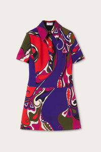 With its pointed collar, fitted sleeves, and button details, this short dress combines sartorial precision with femininity. The fitted top flatters the silhouette, while the flared skirt adds movement and lightness to the look. Made from cady with a spongy texture and a slight sheen, the garment features the iconic Orchidee print, designed by Emilio Pucci in 1966. A pattern inspired by Eastern aesthetics, enriched with natural and stylized elements: orchids intertwine with buds and swirls that elegantly envelop the body. - To offer you a unique Pucci garment, we use an all-over print that makes the product unrepeatable. Therefore, the pattern print may vary from the one displayed in the photo. - Multicolor - Cady - Pointed collar - Fitted elbow-length sleeves - Flared skirt - Button details - Dry clean only - Made in Italy - ID: 5URG155U738017