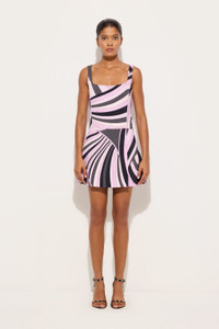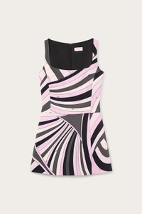 A minimalist design that plays with volumes and symmetry. This sleeveless short dress features an elegant square neckline and a small front slit that adds lightness and movement to the silhouette. The Iride print in black and pink illuminates the fabric with its vibrant, multicolored arches, evoking the brilliance and energy of the 1970s. Made from soft, spongy cady fabric, this style flatters the figure with refined simplicity, making it ideal for special occasions with a graphic, contemporary feel. - To offer you a unique Pucci garment, we use an all-over print that makes the product unrepeatable. Therefore, the pattern print may vary from the one displayed in the photo. - Black and Pink - Printed cady - Sleeveless - Open square neckline - Mini length - Front slit - Dry clean only - Made in Italy - ID: 5URG305U758010