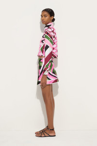 This cropped shirt interprets the Vivara print in a new palette of pink and khaki, maintaining the graphic strength of the pattern created by Emilio Pucci in 1965 and inspired by the island of Vivara seen from above. Its organic and geometric lines flow across the silk twill with a vibrant rhythm, while the short cut, modern fit, and button detail extending to the collar lend freshness and character to the garment. A lightweight, bright, and bold style, perfect for revamping the iconic print with a contemporary attitude. - To offer you a unique Pucci garment, we use an all-over print that makes the product unrepeatable. Therefore, the pattern print may vary from the one displayed in the photo. - Pink and Khaki - 100% Silk - Cropped cut - Front button closure - Button decoration on the collar - Long sleeves - Dry clean only - Made in Italy - ID: 5URJ165U730P11