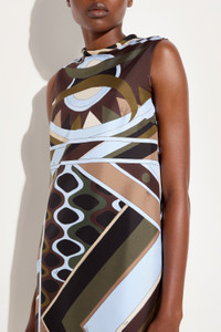 A simple, bright dress that lets the graphic power of the Vivara print shine through. The clean lines of the sleeveless design and round neckline create a balanced silhouette, designed to enhance the body's natural movement. The silk twill provides structure and fluidity, while the khaki and blue print enlivens the surface with a vibrant, contemporary rhythm. A refined garment where color and material take center stage. - To offer you a unique Pucci garment, we use an all-over print that makes the product unrepeatable. Therefore, the pattern print may vary from the one displayed in the photo. - Khaki and Blue - Main material: 100% silk - Lining: 67% acetate, 33% polyester - Silk twill - Round neckline - Sleeveless - Delicate dry clean - Made in Italy - ID: 6HRG056H841016