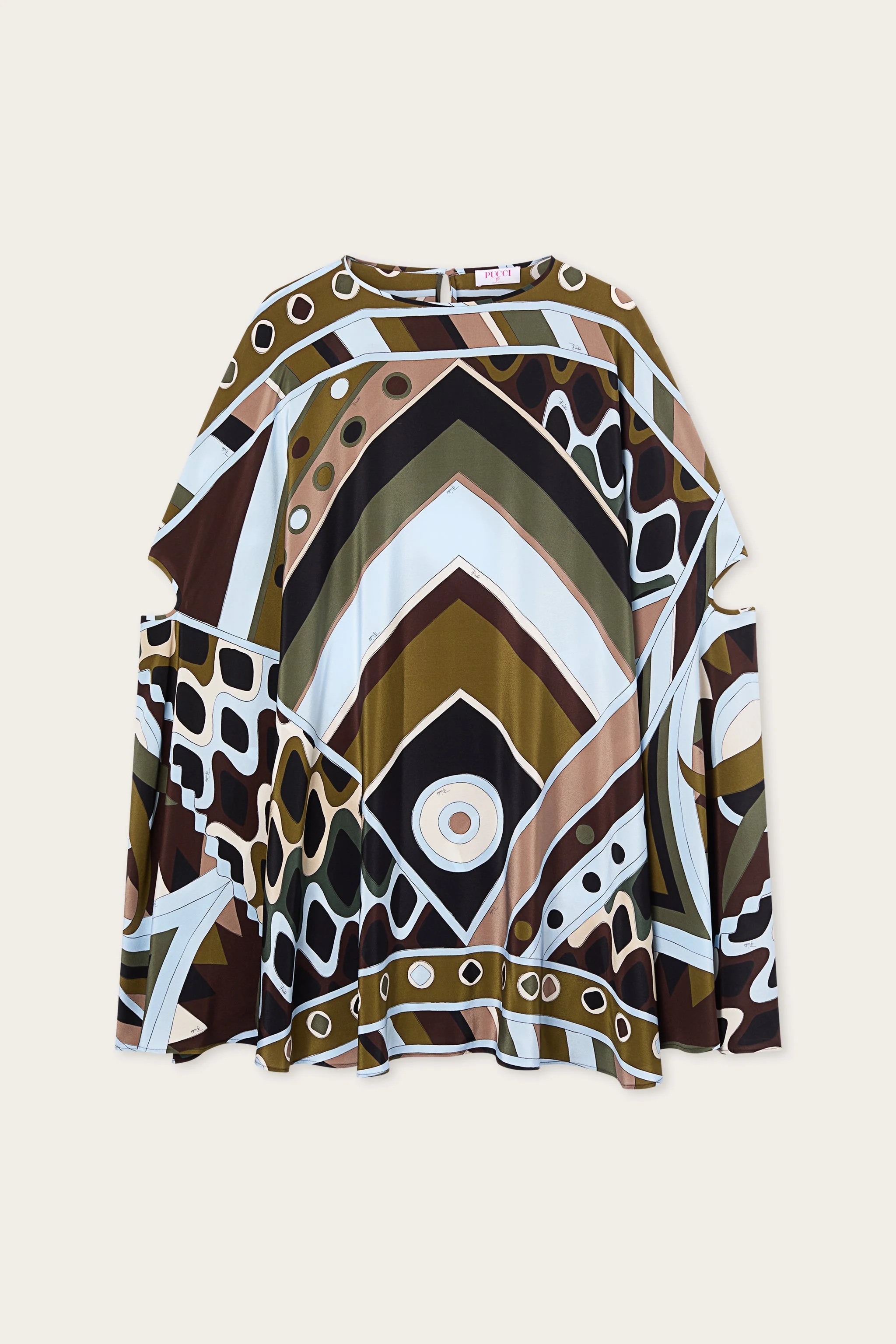 A lightweight, bold garment that reinterprets the kaftan in a contemporary key. Made from silk crepe de chine, it glides naturally over the body, offering a fluid, airy silhouette. The printed details enhance the surface with a vibrant graphic rhythm, while the Vivara print in shades of khaki and blue adds character and depth to the design. A fresh and feminine balance, designed to accompany movement with elegance and personality. - To offer you a unique Pucci garment, we use an all-over print that makes the product unrepeatable. Therefore, the pattern print may vary from the one displayed in the photo. - Khaki and Blue - 100% silk - Printed details - Delicate dry clean - Made in Italy - ID: 6HRL026H843016