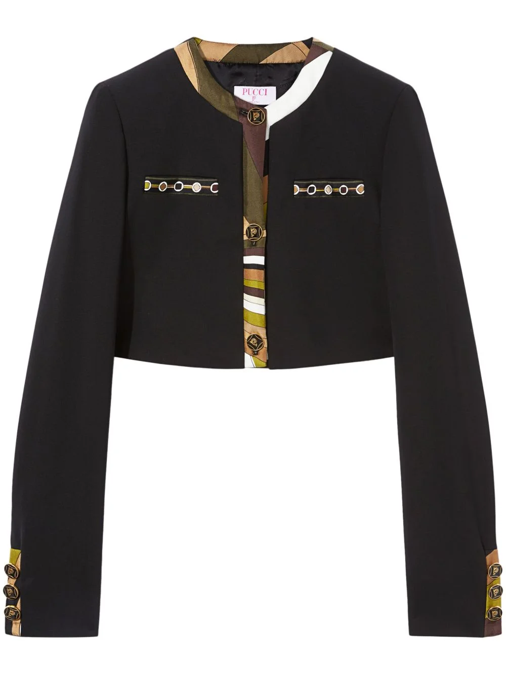 Vivara-print jacket Highlights - Black - Front button fastening - Jetted chest pocket - Front button fastening - Cropped Made in Italy Composition Outer: Virgin Wool 95%, Spandex/Elastane 5% Lining: Viscose 100% Washing instructions Dry Clean Only