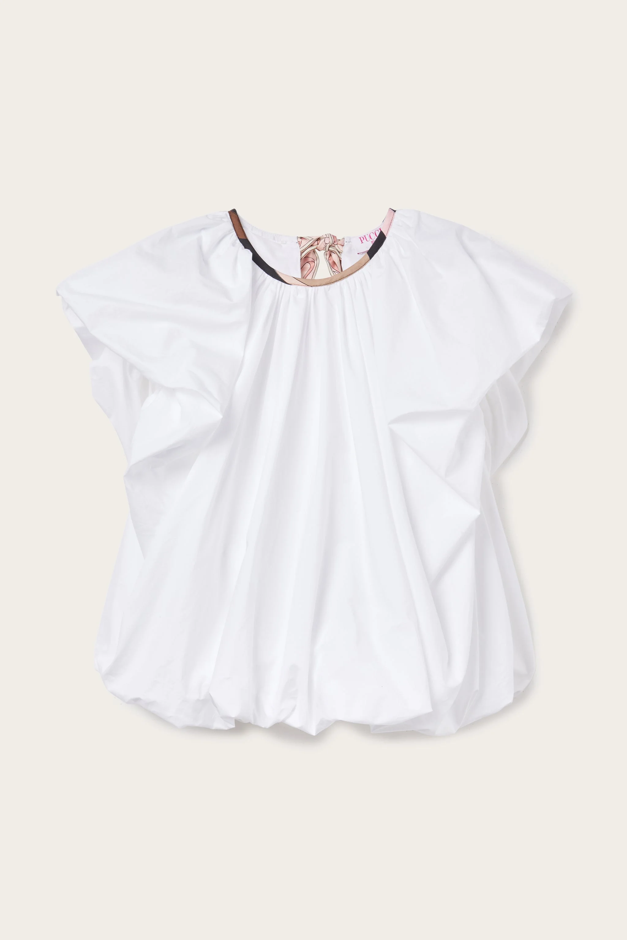 A top that celebrates lightness and femininity with a refined, modern design. Featuring a loose silhouette and ruffles along the hem, this sleeveless piece is perfect for adding movement and freshness to your looks. The round neckline and tie at the back of the neck add a touch of understated elegance, ideal for both casual and sophisticated outfits. Embellished with printed silk profiles, which give a colorful and sophisticated accent, it is the perfect garment to face the summer season with style and comfort. - White - Lightweight cotton poplin with soft finish - Silk printed trim - Sleeveless - Round neckline with drawstring at back of neck - Curls along hem - Gently wash max 30°C - Made in Italy - ID: 5HRM165H603100 - The model is 177 cm tall and wears a 38 italian size.