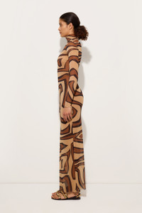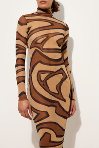 A second-skin effect garment that combines transparency and iconic Pucci motifs. This long-sleeved dress is made from lightweight, stretchy tulle that is soft to the touch and perfect for hugging the silhouette. The high neck adds a touch of modern elegance, while the gold Labirinto print adds movement and character for a sensual yet refined look. - Gold - Lightweight, stretchy tulle with a second-skin effect - 100% polyamide - Long sleeves - High neck - Fitted fit - Delicate wash max 30°C - Made in Italy - ID: 5UJI275U749050