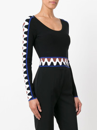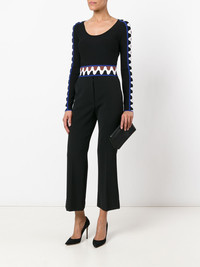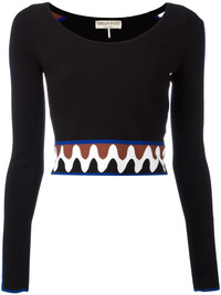 wave pullover crop top Black wave pullover crop top from Emilio Pucci featuring a scoop neck, long sleeves, a cropped length and a contrast wave stripe print down the sleeves and at the hem. Made in Italy Composition Viscose 72%, Polyester 28% SIZE & FIT Model measurements Height 5 ft 10 in(1.79 m) Bust/Chest 32.67 in(83 cm) Hips 35.43 in(90 cm) Waist 24.01 in(61 cm) Washing instructions Dry Clean Only