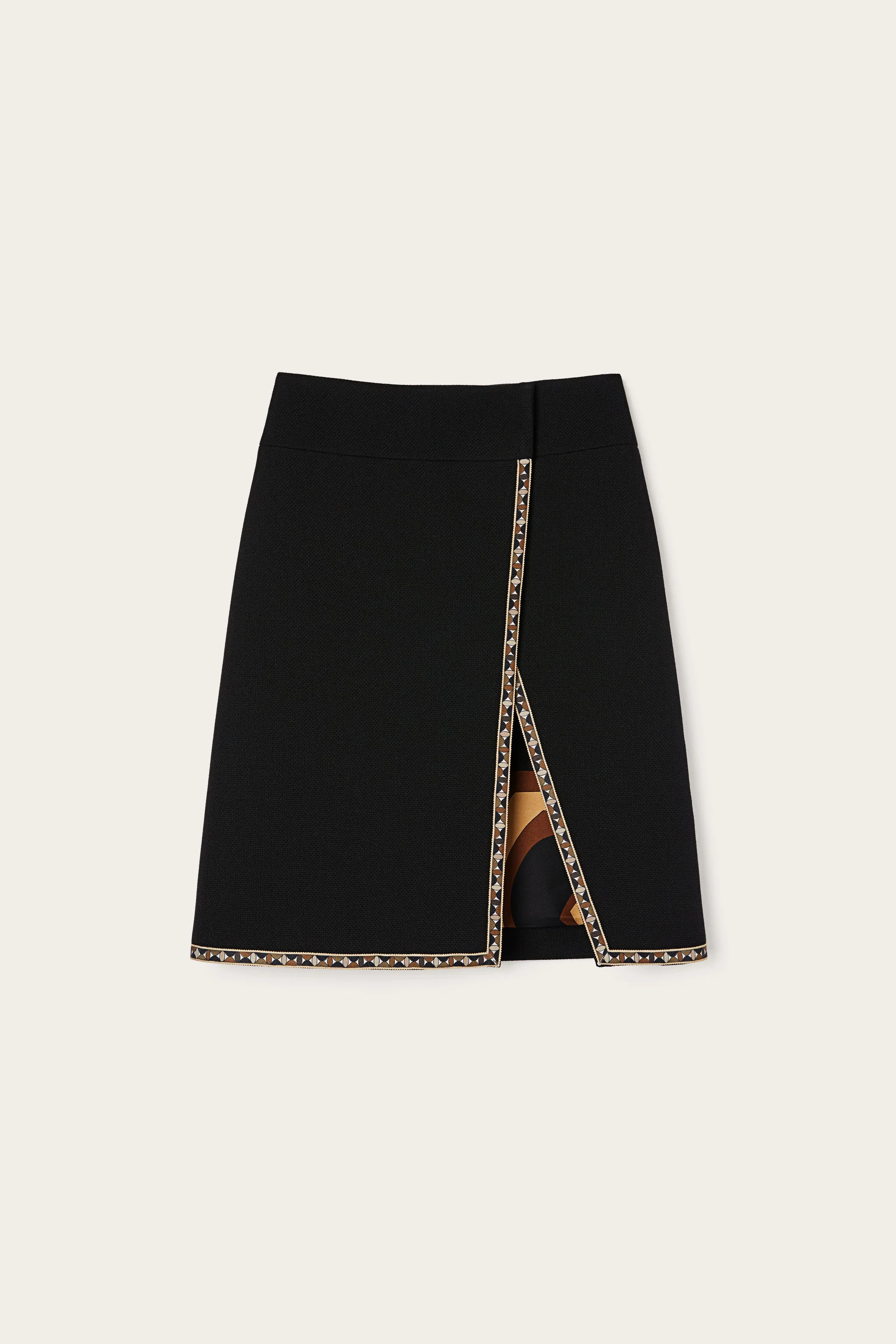A simple cut and graphic decoration define this knee-length skirt, part of a suit with modern and sophisticated appeal. Made from compact virgin wool, it features a side slit that adds movement to the linear silhouette. The edges are finished with black and gold Labirinto printed silk inserts, a nod to the Pucci tradition reinterpreted in a geometric and refined key. - Black - Knee length - Side slit with printed trim - Regular waist - Side zip closure - Main fabric: 100% virgin wool – Lining: 67% acetate, 33% polyester - Dry clean only - Made in Italy - ID: 5URV015U600999