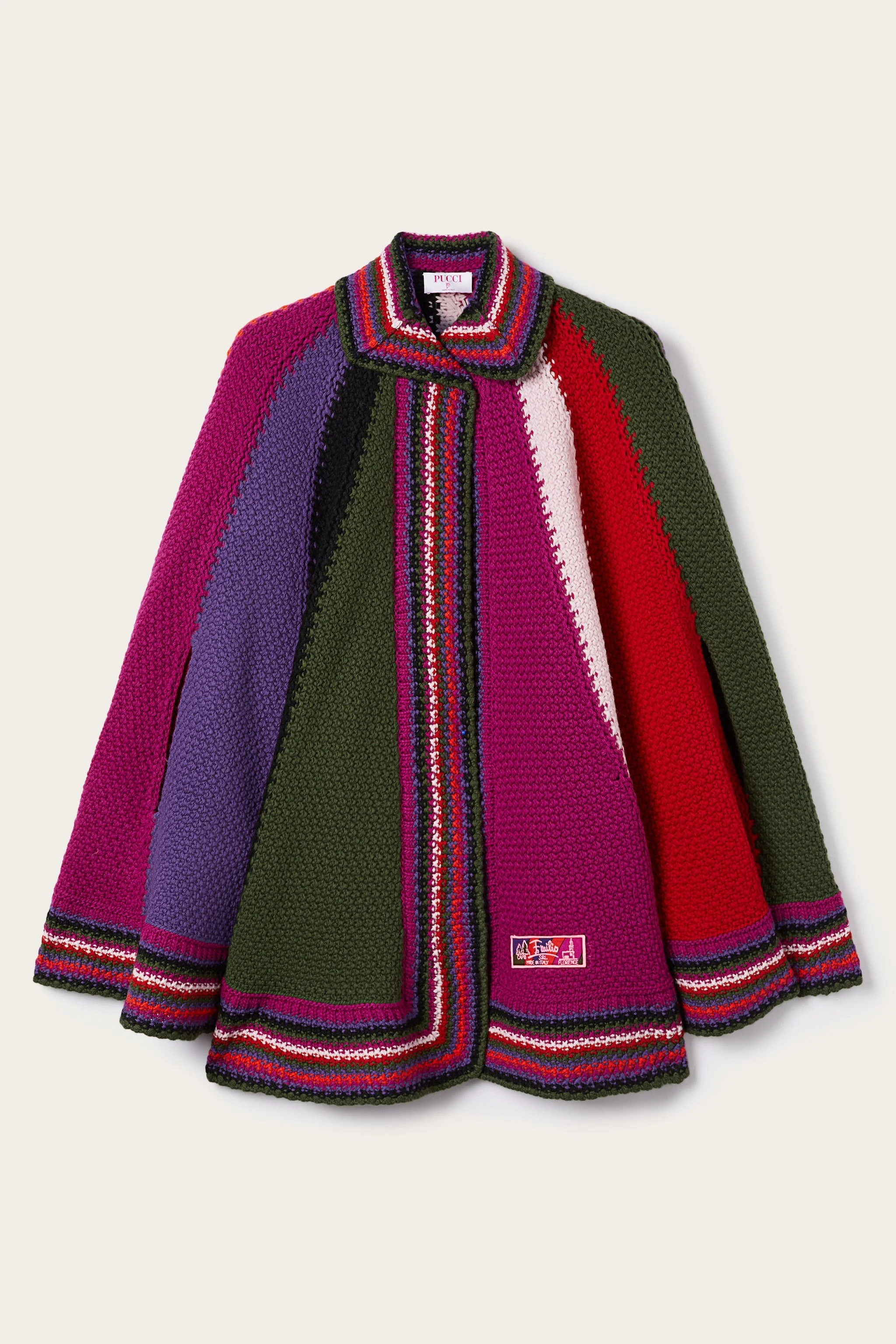 An iconic piece that tells the Pucci story with vibrant details. This cape, embellished with an embroidered patch, celebrates the 1966 Orchidee archive print. The print comes to life with stylized orchids, buds, and organic curves that blend into a sinuous pattern that elegantly envelops the body. - Multicolor - 100% wool - Color block with embroidered patch - Soft and enveloping fit - Dry clean only - Made in Italy - ID: 5UKA015U963017