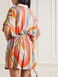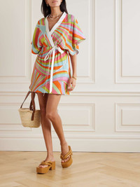 EDITORS'NOTES PUCCI makes dressing for vacation feel all the more glamorous. Made in Italy from lightweight cotton crepon, this mini dress is printed with colorful, swirling stripes. It has a wrap-effect bodice and elasticated waistband threaded with adjustable drawstrings. Wear yours when heading from the pool to check out local sights. SIZE & FIT Model measurements: - Fits true to size, take your normal size - Designed for a relaxed fit, use the adjustable drawstring to cinch in at the waist - Lightweight, non-stretchy fabric - Model is 177cm/ 5'10" and is wearing a size Small - Bust: 82cm/ 32" - Waist: 64.5cm/ 25" - Hip: 89.5cm/ 35" DETAILS & CARE - Multicolored cotton crepon - Slips on - 100% cotton - Dry clean