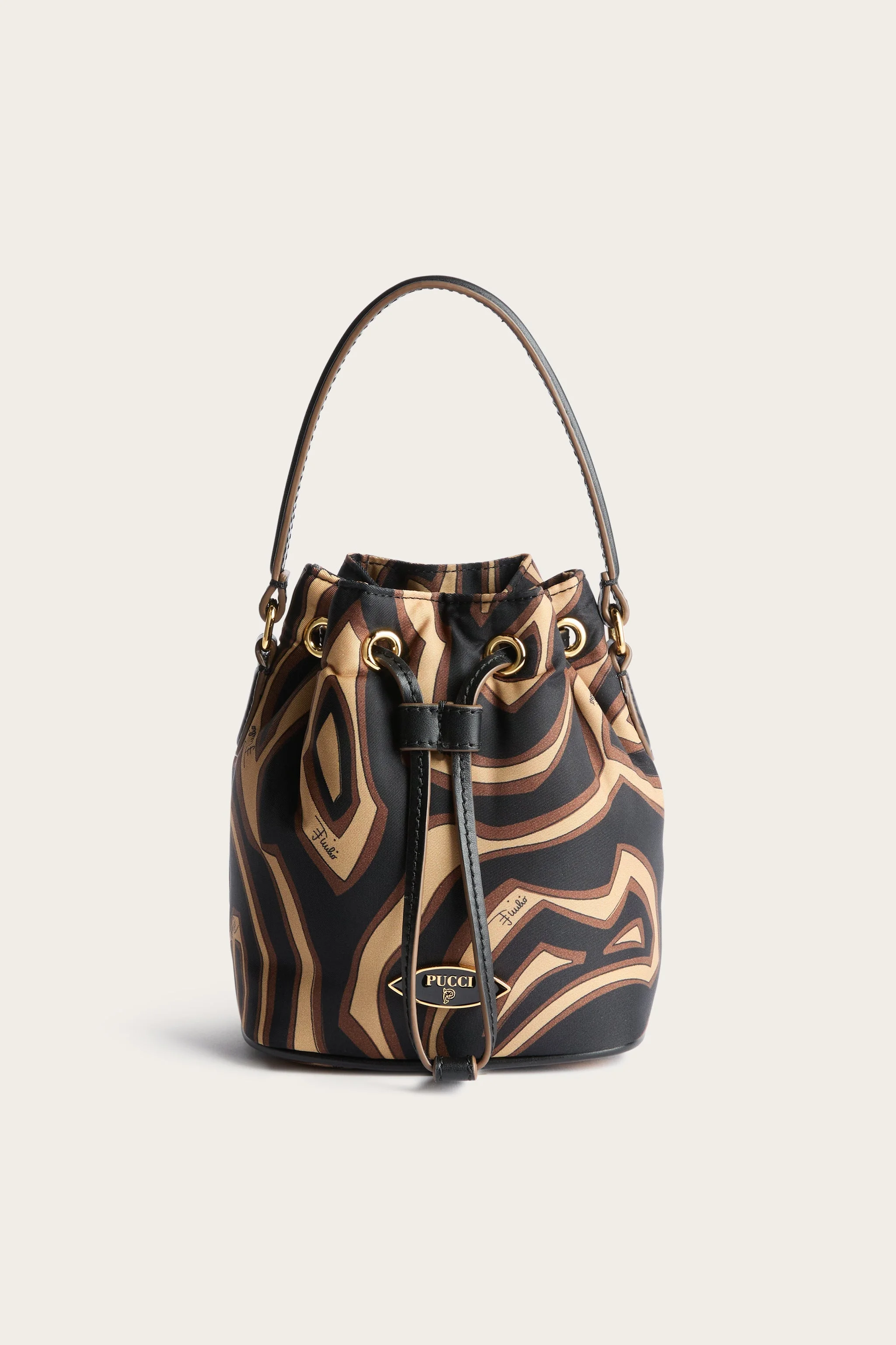 Soft, versatile, and instantly recognizable, the Yummy bucket bag captures the lively spirit of Pucci with its black and gold Labirinto print, a graphic touch that makes any look special. Crafted from padded nylon, it is finished with nappa leather details, enameled plates, and iconic fish-shaped elements. The short handles and adjustable shoulder strap with hook offer maximum practicality, while the drawstring and flat interior pocket enhance its functionality. - Black and Gold - Exterior (fabric): 100% polyamide – Leather exterior: 100% calfskin - Handles: length 8 cm - Adjustable shoulder strap with hook: length 50 cm - Drawstring closure - Flat interior pocket - Enamelled Pucci plaque and fish detail - Contrasting edges - Gold galvanized color - Made in Italy - ID: 5UBC305U182061