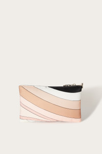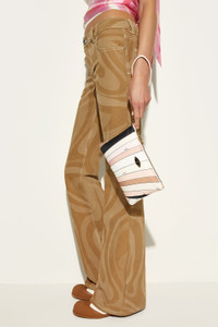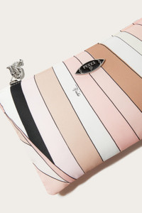 This padded nylon pouch is designed to offer lightness and durability, with a zipper closure and handle that makes it convenient to carry.The iconic Iride print in nude lends a distinctive touch, while the contrasting edges and enameled Pucci plaque enhance its elegance. The fish-shaped zipper pull adds a playful detail, making this a one-of-a-kind accessory. Inside, a flat pocket allows you to better organize small essentials. - To offer you a unique Pucci garment, we use an all-over print that makes the product unrepeatable. Therefore, the pattern print may vary from the one displayed in the photo. - Nude - Outer: 100% Polyamide - Cowhide trim - Interior: 100% Polyamide - Zip closure - Carrying handle - Enameled Pucci plaque - Fish-shaped zipper - Contrasting edges - Interior flat pocket - Non-washable. - Made in Italy. - ID: 5HSC205H152007