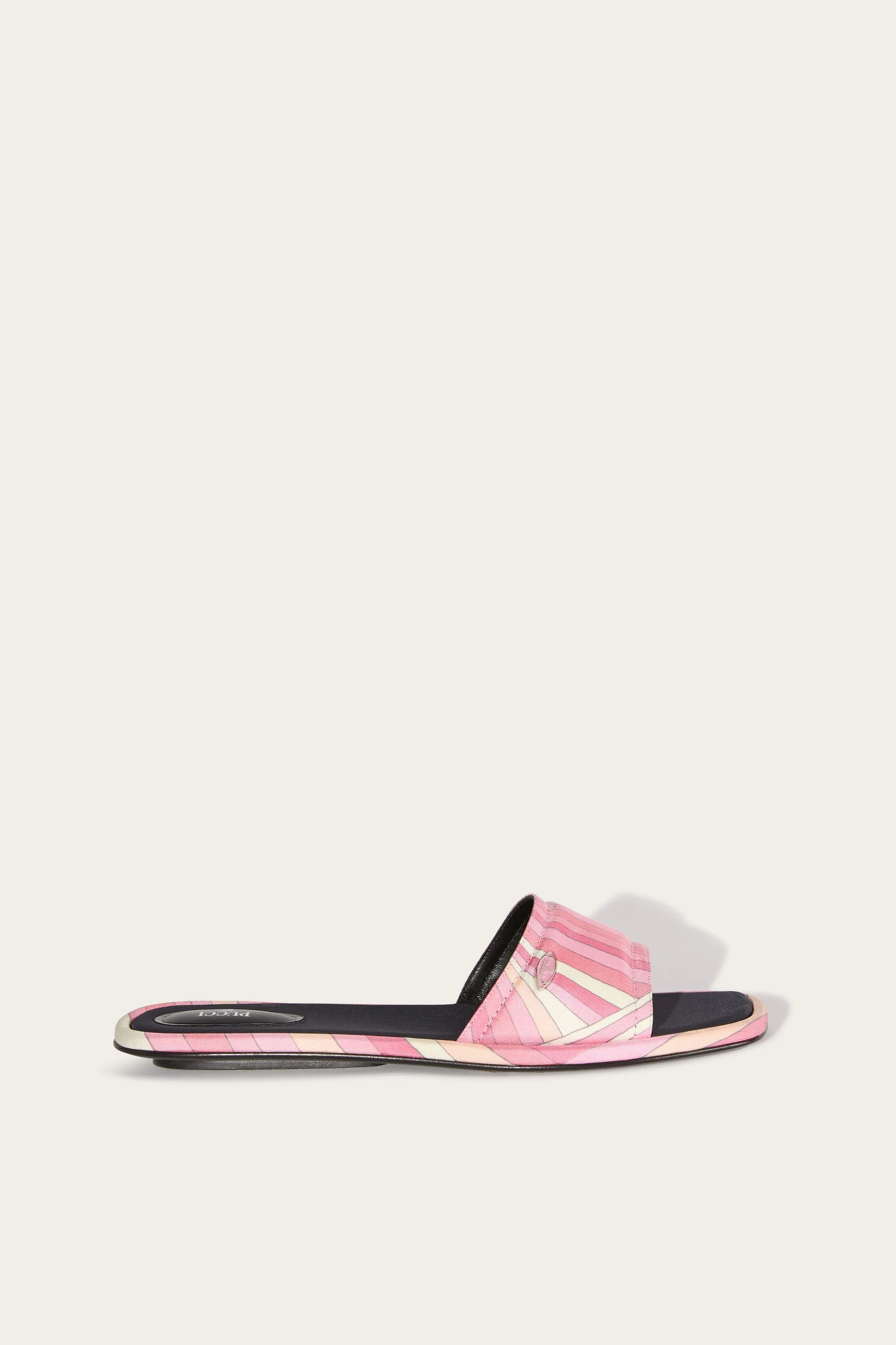 Perfect for a promenade or for adding a touch of elegance to an outdoor aperitif, these silk twill sandals are your ticket to effortless, refined style. The Pucci print in the pink Iride variant lends vibrancy and femininity, turning a simple sandal into a luxurious accessory.The front band with logo plaque adds a distinctive and sophisticated touch, while the silk twill wraps the foot lightly. - Pink - Twill silk print - Logo plaque on front band - Iride print - ID: 5HCA035H151057