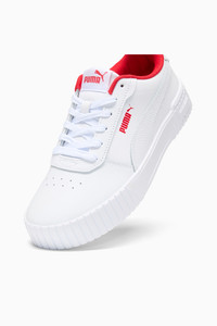 PRODUCT STORY Introducing the Carina 2.0. Taking its design cues from the '80s, this classic tennis silhouette feels right at home with the laid-back sneaker style of Californian beach towns. Staying true to its beloved look and feel, Carina steps into the new season with some refreshments: wider lines on the heel and perforations on the vamp bring added edge. What's more, our SOFTFOAM+ sockliner is there to provide soft cushioning and comfort all day long. FEATURES & BENEFITS - Recycled Content: Made with at least 20% recycled material as a step toward a better future - SOFTFOAM+: Step-in comfort sockliner designed to provide soft cushioning thanks to its extra thick heel DETAILS - Style: 385849_26 - Color: PUMA White-PUMA White-For All Time Red - Leather upper with perforated vamp - Rubber midsole and outsole - Wider vertical lines on heel - PUMA Formstrip on medial and lateral sides - PUMA Cat Logo on heel MATERIAL INFORMATION - Sockliner: 100% Textile - Outsole: 100% Rubber - Upper: 55.16% Leather - cow, 41.86% Synthetic, 2.98% Textile - Lining: 100% Textile