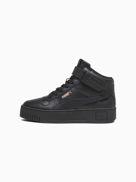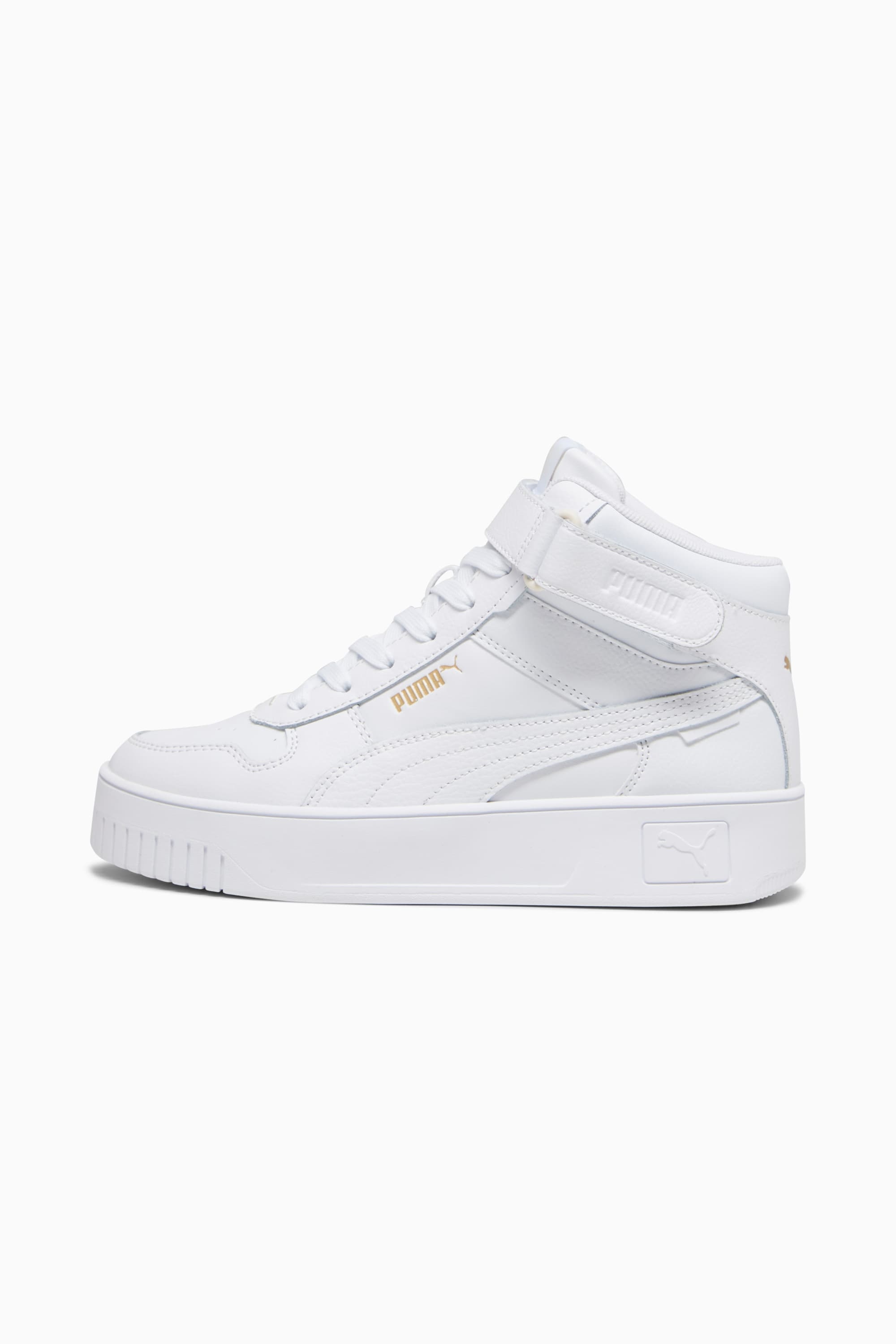 PRODUCT STORY Carina is contemporary California cool meets '80s retro design. The laidback throwback is packed with details that turn an everyday sneaker into an essential piece of fashion-forward footwear – from the SoftFoam+ sockliner to the elevated platform sole. FEATURES & BENEFITS - PUMA’s leather products support responsible manufacturing via the Leather Working Group.www.leatherworkinggroup.com - The upper of this shoe is made with at least 30% recycled materials and the bottom is made with at least 10% recycled materials, as a step toward a better future. - SOFTFOAM+: Step-in comfort sockliner designed to provide soft cushioning thanks to its extra thick heel DETAILS - Style: 392337_01 - Color: PUMA White-PUMA White-PUMA Gold - Full suede leather upper - PUMA Formstrip on lateral and medial sides - PUMA branding details - Platform style - Rubber outsole MATERIAL INFORMATION - Sockliner: 100% Textile - Outsole: 100% Rubber - Upper: 52.67% Leather - cow, 47.33% Synthetic - Lining: 100% Textile