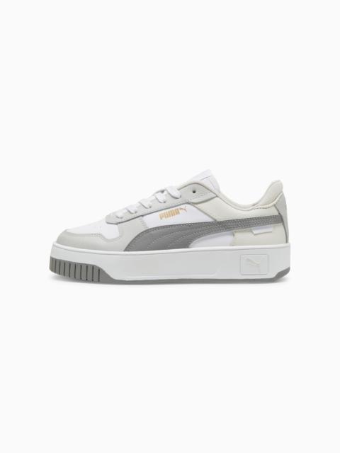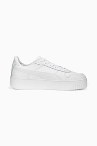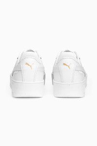 PRODUCT STORY Streetwear-inspired design and a slightly elevated platform make these Carina's perfect for everyday outfits. FEATURES & BENEFITS - SOFTFOAM+: Step-in comfort sockliner designed to provide soft cushioning thanks to its extra thick heel - FOREVER BETTER: The upper of this shoe is made with at least 20% recycled materials as a step toward a better future DETAILS - Style: 389390_01 - Color: PUMA White-PUMA White-PUMA Gold - Leather upper - Rubber midsole - Rubber outsole - PUMA Formstrip on the medial and lateral sides - PUMA Cat Logo on the heel