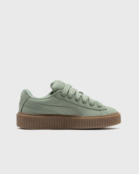 The new FENTY x PUMA Creeper Phatty sneakers feature an eye-catching design fused with soft, natural colors. Gold accents and the classic Creeper sole give this new model from Rihanna a fresh look. - Nubuck leather upper - Lace-up closure - Rubber outsole Article Number: 399866-02 Gender: Women, Kids Color: GREEN FOG-PUMA GOLD-GUM Material: 30% Rubber, 70% Leather