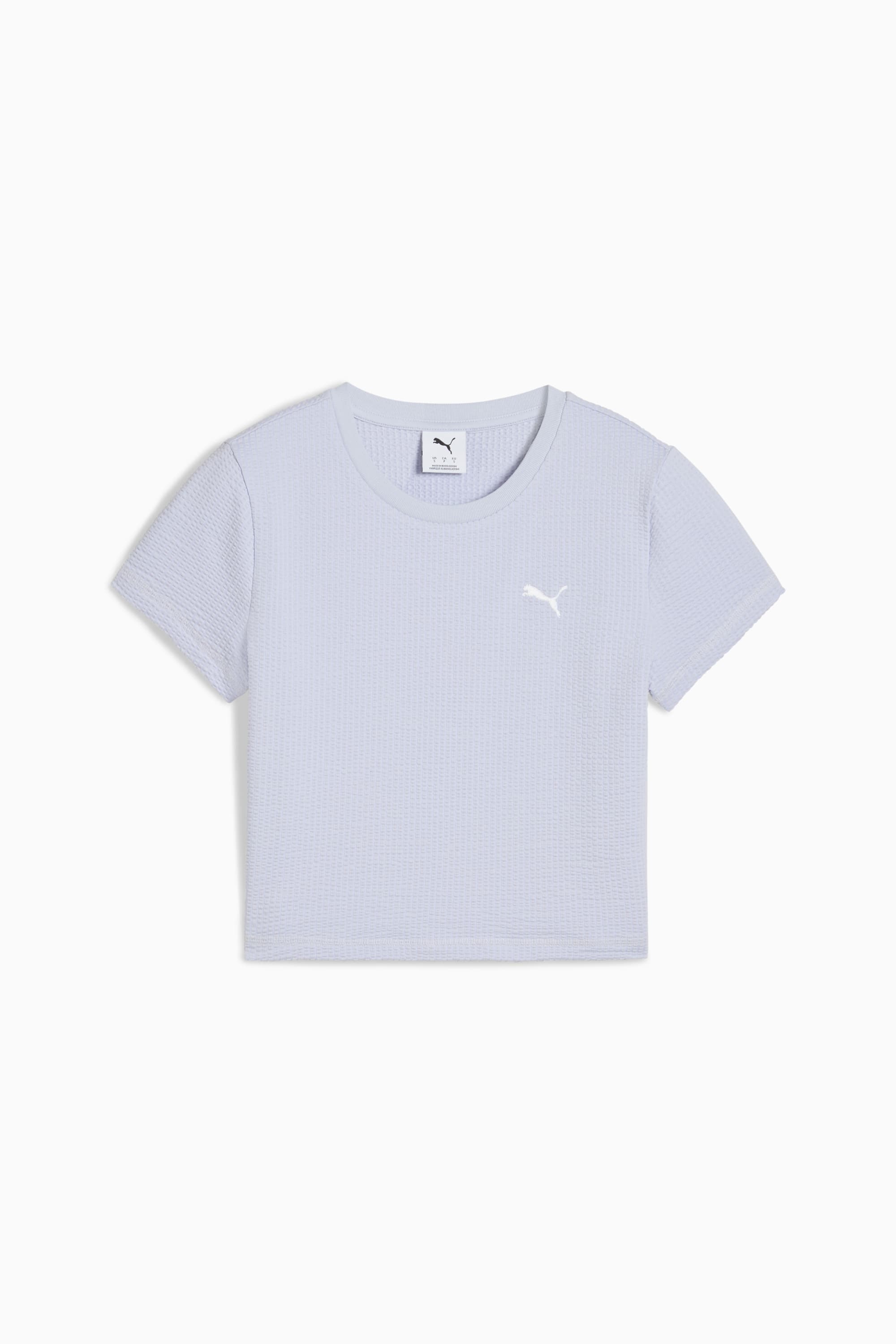 PRODUCT STORY Step up your fashion game with this tee featuring textured fabric and a sleek embroidery detail. It's perfect for adding a touch of sophistication to any outfit. Feel confident and stand out with PUMA's signature flair. FEATURES & BENEFITS - Made with at least 20% recycled materials DETAILS - Style: 629806_47 - Color: Cool Weather - Slim fit - Rib fabric - Cropped length - Crew neck - PUMA branding details