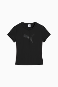 PRODUCT STORY The Dare To collection makes a statement with bold, fearless designs that push the boundaries of fashion and sport. Celebrate your individual style in this graphic tee. Dare to stand out. Dare to be bold. Dare to be you. FEATURES & BENEFITS - MOISTURE MANAGEMENT: Technical dryCELL fabrics wick moisture away from the skin to help keep you dry and comfortable - Made with at least 50% recycled materials. DETAILS - Style: 634600_01 - Color: PUMA Black - Fit: Slim - Main material type: Tricot - Neck: Crew neck - Short sleeves - Fastener: Half zip - Length: Short MATERIAL INFORMATION - Shell: 77% nylon, 23% elastane
