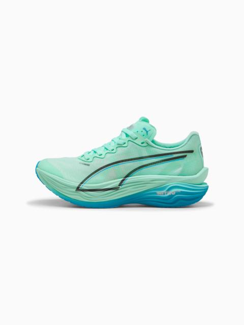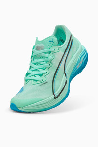 PRODUCT STORY Hit turbo speed. The Deviate NITRO™ Elite 3 is a running shoe redesigned for lightweight, race day propulsion. A carbon fibre PWRPLATE ensures stability and maximum running efficiency, while NITROFOAM™ ELITE offers supreme cushioning that won't weigh you down. It's a running go-to made with lightweight mono-mesh and durable PUMAGRIP rubber for multi-surface traction and an effortless run. FEATURES & BENEFITS - NITROFOAM™ ELITE: Premium performance foam technology that provides pinnacle responsiveness in an extremely lightweight package - PWRPLATE: Carbon fibre plate engineered to stabilise the midsole while maximising energy transfer - ULTRAWEAVE: Ultra-light, engineered fabric with a structured, 4-way stretch that reduces weight and friction. Built for athletes looking to increase speed and strength DETAILS - Style: 309810_07 - Color: Mint Melt-Speed Blue - Regular fit - ULTRAWEAVE upper - Stack height: 40mm/32mm - Weight: 194g (size UK8) - Heel-to-toe drop: 8mm - Recommended for: neutral pronators MATERIAL INFORMATION - Midsole: 100% Synthetic - Sockliner: 100% Textile - Outsole: 87% Rubber, 13% Synthetic - Upper: 82% Textile, 18% Synthetic - Lining: 100% Textile
