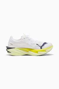 PRODUCT STORY When fast isn’t fast enough, you go beyond. The Deviate NITRO™ Elite 4 is built for race day – those moments when every second counts. Upgraded NITROFOAM™ ELITE delivers elite responsiveness for unbeatable speed, while a reengineered PWRPLATE channels every ounce of energy forward. 12% lighter than its predecessor, Deviate Elite 4 will keep you light, fast, and locked on your goal pace. Every detail is engineered to take you beyond fast. FEATURES & BENEFITS - NITROFOAM™ Elite: Premium performance foam technology that provides pinnacle responsiveness in an extremely lightweight package - PWRPLATE: Carbon fibre plate engineered to maximize energy transfer and delvier a propulsive ride - PUMAGRIP: Durable performance rubber compound designed for all-surface traction DETAILS - Style: 312128_06 - Color: PUMA White-Apple Spritz-Lux Lime - Width: Regular - Toe type: Rounded - Closure: Laces - Stack height: 40mm/32mm - Heel type: Flat - Weight: 170g (size UK8)? - Cushioning: Max - Heel-to-toe drop: 8mm - Pronation: Neutral - ULTRAWEAVE for an ultra-lightweight feel with PWRTAPE for lockdown MATERIAL INFORMATION - Midsole: 100% Synthetic - Sockliner: 100% Textile - Outsole: 98% Synthetic, 2% Rubber - Upper: 74% Textile, 26% Synthetic - Lining: 100% Textile