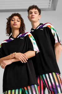 PRODUCT STORY Show your pride on and off the field with this PUMA jersey. Featuring a vibrant shoulder graphic inspired by PRIDE and a sporty rib V-collar, it's all about making empowering statements and unforgettable moments. DETAILS - Style: 629625_01 - Color: PUMA Black-AOP - Relaxed fit - Double face jacquard fabric - Regular length - Athletic look - Short sleeves - PUMA branding details MATERIAL INFORMATION - Shell: 100% polyester - Rib: 97% polyester, 3% elastane