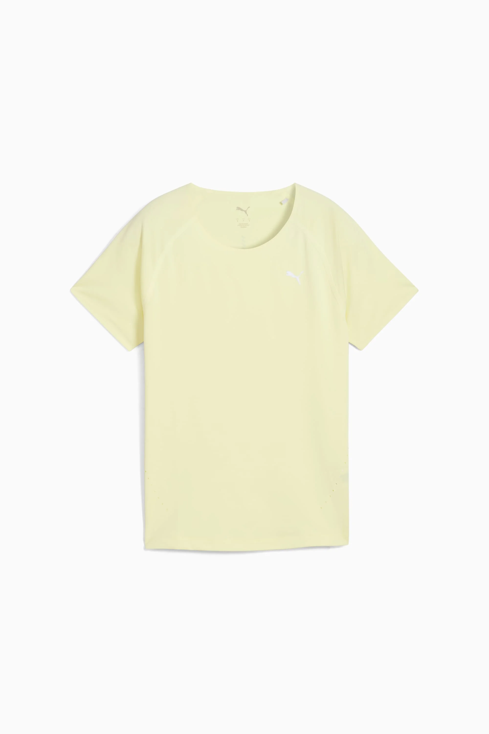 PRODUCT STORY Feel free to run at your best with PUMA's softest fabric, CLOUDSPUN, featuring moisture-wicking dryCELL and 4-way stretch. Laser-cut perforations improve breathability, while bonded seams minimize friction. Thermoadapt technology helps keep you cool as you push your limits. FEATURES & BENEFITS - Made with at least 90% recycled materials - dryCELL: Performance technology designed to wick moisture from the body and keep you free of sweat during exercise - CLOUDSPUN: Custom-milled performance poly/spandex blend, this fabric meets the highest performance standards while still feeling like an ultra soft cotton - Thermoadapt: HeiQ smart temp is a thermos regulation technology that provides fabrics with the ability to dynamically respond to body heat DETAILS - Style: 526652_35 - Color: Gold Moon - Slim fit - Jersey fabric - Regular length - Crew neck - Short sleeves - PUMA branding details MATERIAL INFORMATION - Shell: 94% polyester, 6% elastane