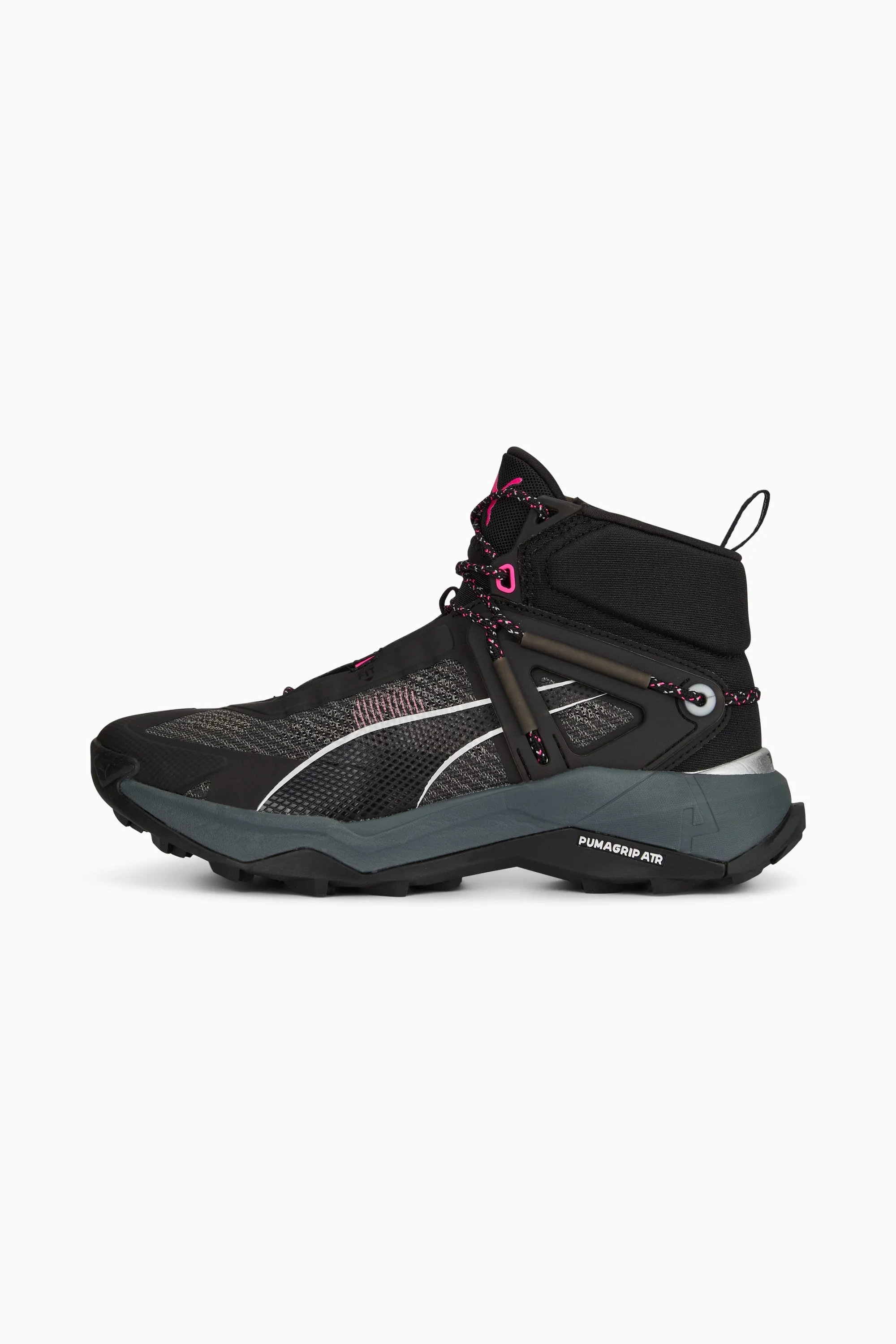 PRODUCT STORY Introducing our first hiking-specific shoe: the Explore NITRO™ Mid. It's designed for all trails, from flat and gravelly to steep and rocky, with a combination of NITROFOAM™ and PROFOAMLITE through the midsole maximising comfort over any terrain. Throw in a PUMAGRIP ATR outsole and a unique collar shape – complete with integrated, heel supporting lacing system – and you have your next trail companion. Get ready to tackle and terrain, no matter the season. FEATURES & BENEFITS - NITRO™: Advanced nitrogen-infused foam designed to provide superior responsiveness and cushioning in a lightweight package - PROFOAMLITE: Extremely lightweight EVA designed to cushion your landing and propel each step - PUMAGRIP ATR: Trail-ready performance rubber compound designed for traction on ice, mud, and unstable surfaces - Recycled content: The upper of this shoe is made with at least 50% recycled materials as a step toward a better future DETAILS - Style: 377859_01 - Color: PUMA Black-PUMA Silver-Ravish - Mid-cut booty construction - Mono-mesh upper - Flared midfoot shape - Toe drainage port - OPTIFIT adaptive fit system designed to offer a secure lockdown and support during exercise - Cushioning level: Medium - Heel-to-toe drop: 6mm - Best for: Neutral pronators