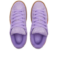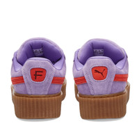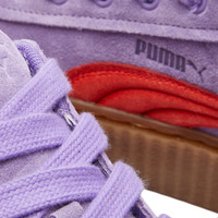 Rihanna elevates the chunky shoe trend with her updated PUMA Creeper this season. In a "Lavender Red" colourway, this silhouette, inspired by the classic PUMA Suede design, offers more style and confidence than its 2015 predecessor. It shows off a light purple suede upper with a contrasting red Formstrip. You'll find debossed PUMA branding, co-branded heel logos and thick laces for a bold look. And of course, a platform-like gum rubber sole completeles this pair taking them to new heights. - Suede Uppers - Gum Rubber Sole