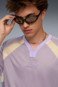 PRODUCT STORY Rihanna’s take on the classic football jersey, the FENTY x PUMA Shortsleeve Jersey features contrast mesh side panels, tonal piping, and ribbed details. Finished in soft purple and cream tones with a metallic FENTY x PUMA woven label, it’s a pitch-perfect remix. FEATURES & BENEFITS - Made with 100% recycled material excluding trims & decorations. DETAILS - Style: 635638_30 - Color: Pale Plum - Relaxed fit - Main material type: Polyester - Short sleeves - V-neck - Apparel length: Regular - Inspired by classic football jerseys - Contrast mesh side panels - Piping and ribbed details - FENTY x PUMA co-branding details MATERIAL INFORMATION - Inserts: 100% polyester - Shell: 100% polyester - Collar: 100% polyester