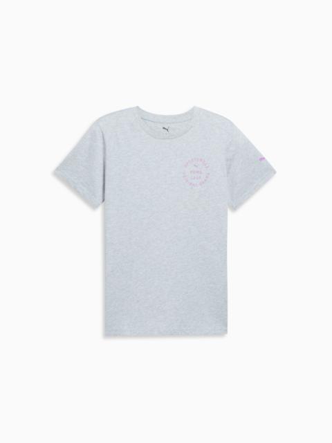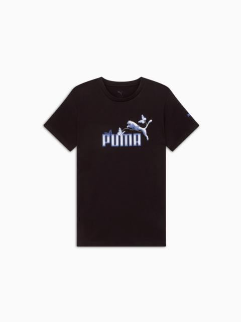 PRODUCT STORY Bring a cool boost to your wardrobe with this cozy cotton tee, showcasing butterfly graphics for extra chill vibes. This tee's comfort fit makes it the perfect choice for a laid-back day. FEATURES & BENEFITS - Made with at least 20% recycled cotton DETAILS - Style: 686225_03 - Color: Green Moon - 70% cotton, 30% recycled cotton - Comfort fit - Short sleeves - Crew neck - PUMA branding details MATERIAL INFORMATION - SHELL: 100% cotton - RIB: 70% cotton, 30% polyester