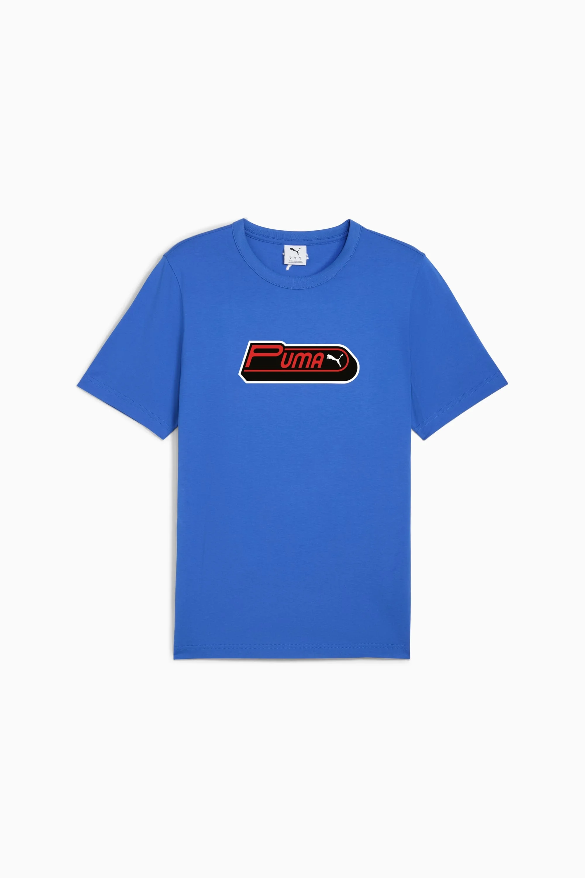 PRODUCT STORY This is the FUTURE.PUMA.ARCHIVE. This street-inspired collection blends the spirit of our past with the limitless possibilities of our future. Retro yet forward-thinking, these styles are designed to make a statement. FEATURES & BENEFITS - Made with at least 20% recycled cotton. DETAILS - Style: 632076_13 - Color: Mountain Blue - Fit: Regular - Main material: Single jersey - Neck: Crew neck - Short sleeves - Length: Regular MATERIAL INFORMATION - Shell: 100% cotton - Rib: 80% cotton, 20% polyester