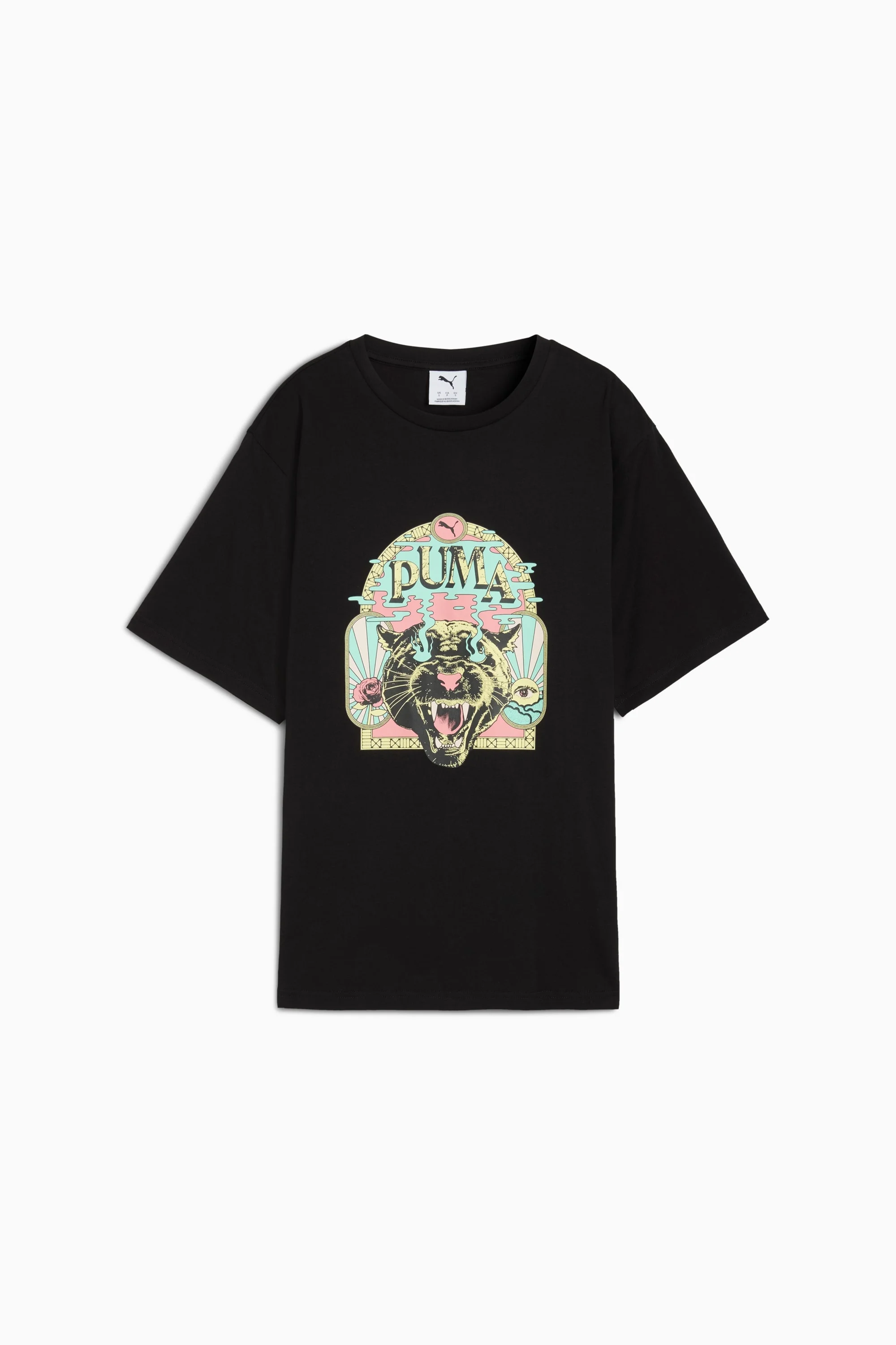 PRODUCT STORY PUMA's collection of graphic tees combines bold designs with casual style, creating comfortable pieces that stand out. From abstract patterns to iconic logos, each design adds a unique touch. No matter where your day takes you, these graphics bring a fresh, cool vibe to your look. FEATURES & BENEFITS - Made with at least 20% recycled cotton. DETAILS - Style: 632161_01 - Color: PUMA Black - Fit: Relaxed - Main material: Single jersey - Neck: Crew neck - Short sleeves - Length: Regular