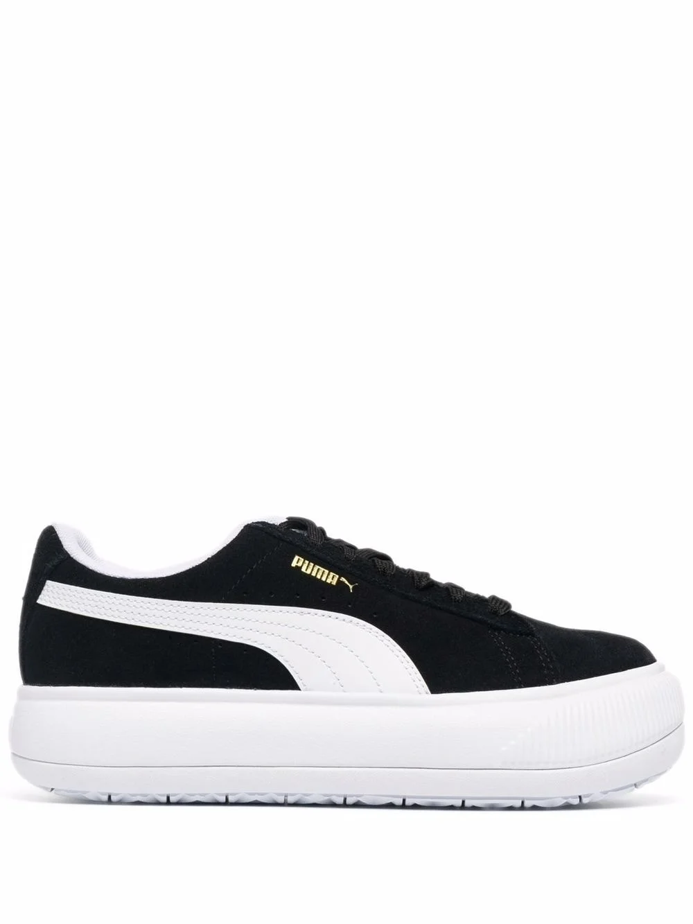 Mayu suede flatform sneakers Black/white suede Mayu suede flatform sneakers from PUMA featuring side stripe detailing, logo print to the side, round toe, front lace-up fastening, branded insole, flatform sole and chunky rubber sole. Imported Composition Lining: Fabric 100% Sole: Rubber 100% Outer: Calf Suede 100% SIZE & FIT Measurement PLATFORM 2 in(5 cm) Sole height 2 in(5 cm)