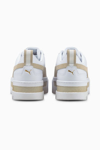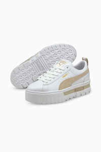 PRODUCT STORY Elevate your street style with the Mayze Leather Sneakers. These trendy platform sneakers offer a bold and stylish look that will turn heads wherever you go. With a sleek leather upper and a chunky platform sole, these sneakers provide both fashion and comfort. Step up your shoe game with the Mayze Leather Sneakers and make a statement with every stride. DETAILS - Style: 381983_02 - Color: Puma White-Peyote - Leather upper with suede and synthetic overlays - Full lace closure - Platform rubber midsole with textured tooling - Rubber outsole provides durable grip and traction - Suede PUMA Formstrip overlay at sides - Striped webbing pull loop at heel - Gold foil PUMA No.2 Logo at lateral side - PUMA label at tongue MATERIAL INFORMATION - Midsole: 100% Synthetic - Sockliner: 100% Textile - Outsole: 100% TR (Thermoplastic Rubber) - Upper: 70% Leather - cow, 27% Synthetic, 3% Textile - Lining: 62.64% Textile, 37.36% Synthetic