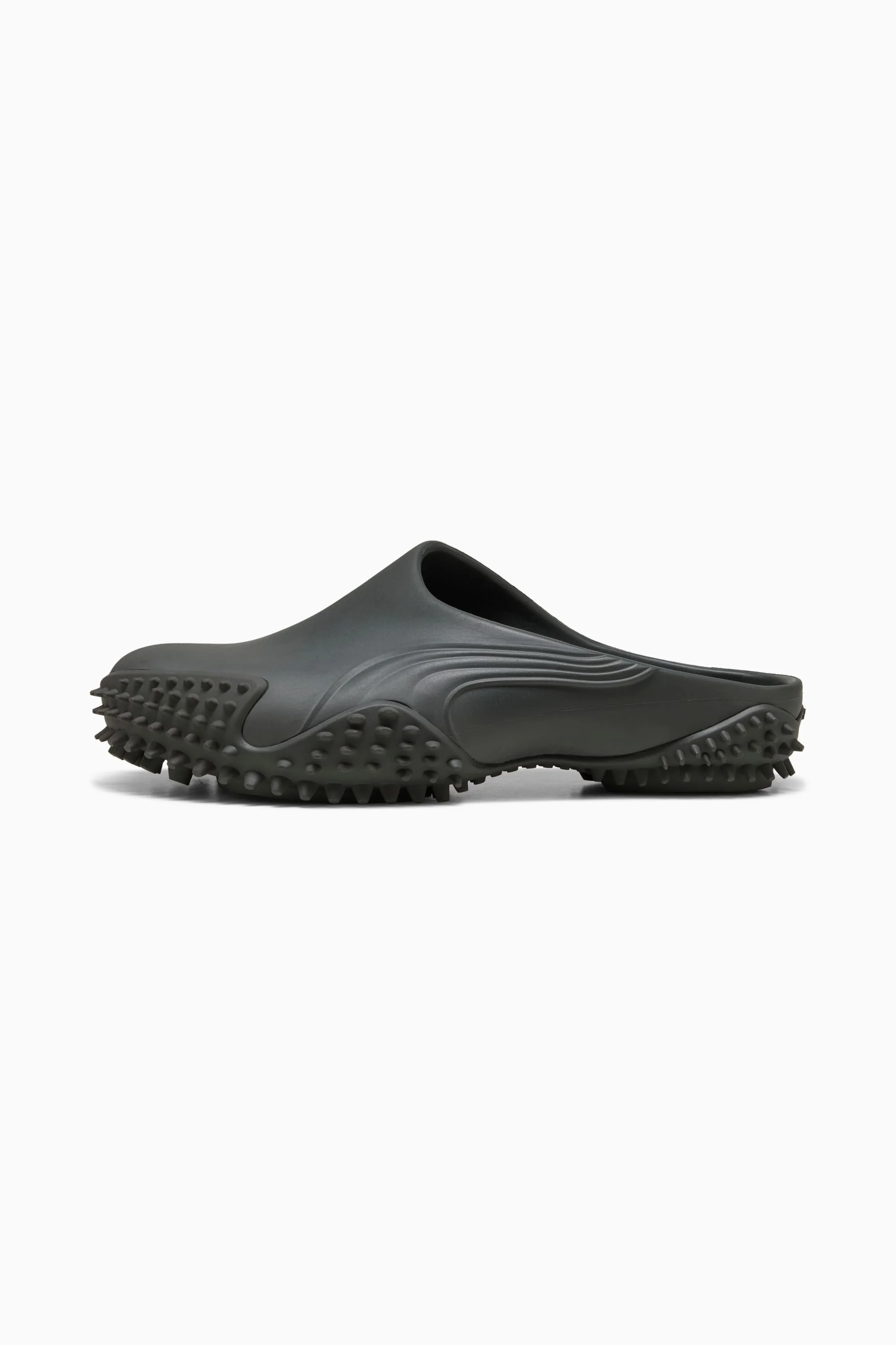 PRODUCT STORY Mostro isn't a shoe for just anyone. For over two decades, it's been worn by those who defy conventions and reject the norm. Taking its name from the Italian word for monster, Mostro is a hybrid creation that draws from two diverse realms: the sleek sprinting spikes of the '60s and the surfing shoes of the '80s. To this day, it continues to captivate with its distinctive, sculptural design, low-profile shape, and avant-garde, spiked sole. This version, the Mostro Mule, is crafted with a slip-on construction and a comfortable molded upper. DETAILS - Style: 404433_01 - Color: Shadow Gray - Regular fit - Rounded toe - Moulded upper - Moulded leather sockliner - Rubber outsole with spikes as design detail MATERIAL INFORMATION - Outsole: 100% Rubber - Upper: 100% Synthetic - Lining: 100% Synthetic