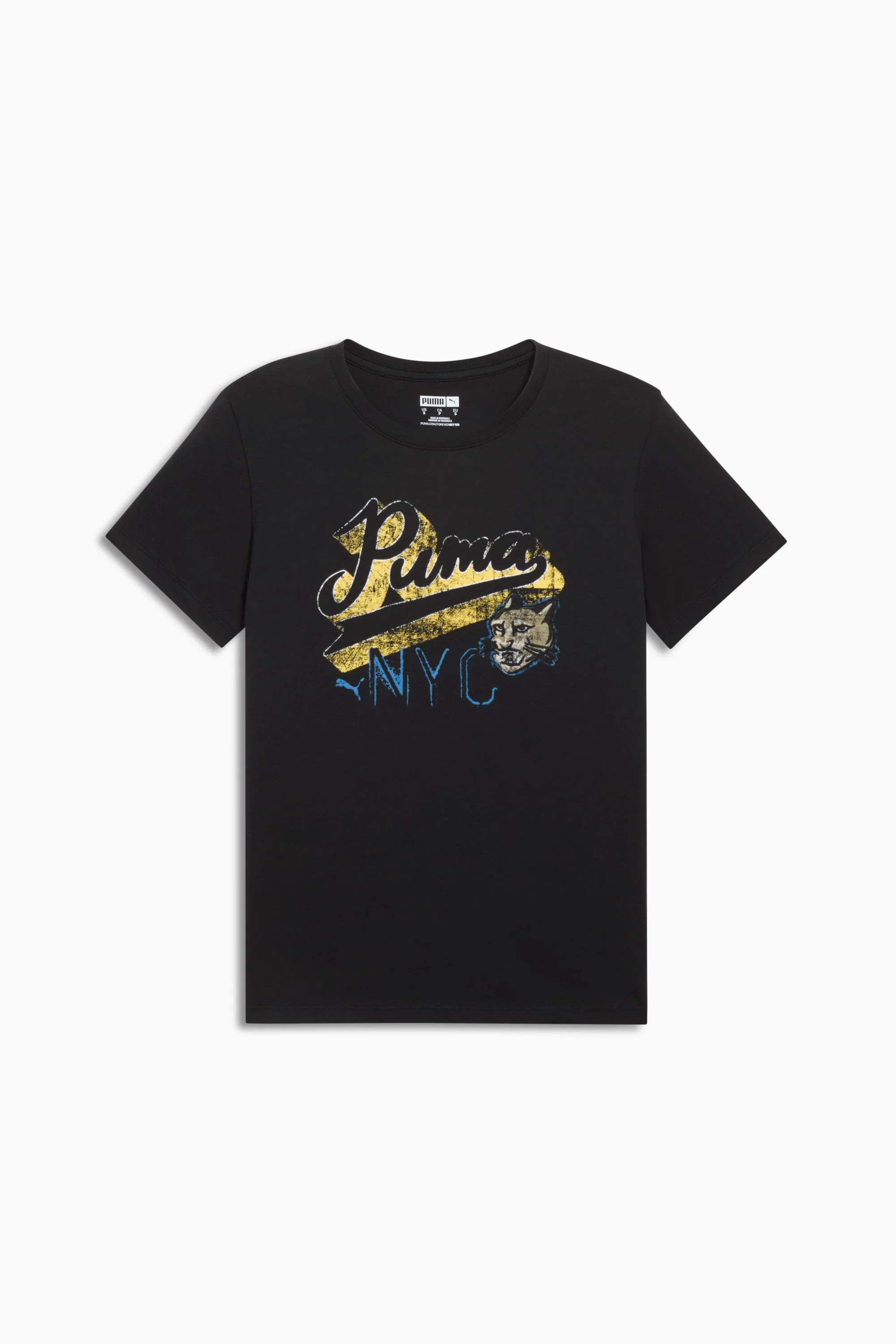 PRODUCT STORY Rep the City That Never Sleeps in PUMA style with this tee, crafted from 100% cotton for a comfortable fit. DETAILS - Style: 633239_01 - Color: PUMA Black - 100% cotton - Short sleeves - Crew neck - Comfort fit - PUMA branding details