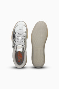 PRODUCT STORY Bold color-blocking meets terrace heritage in this standout design. Crafted with metallic leather for a premium feel, it's perfect for game-day vibes or nights out. Classic T-toe construction channels PUMA's soccer roots while keeping it fresh for today's trendsetters. Make moves with PUMA energy, wherever the game takes you. DETAILS - Style: 404669_01 - Color: Puma Silver-Glacial Gray-Orange Glo - Width: Regular - Toe Type: Rounded - Fastener: Laces - Heel type: Flat MATERIAL INFORMATION - Sockliner: 100% Textile - Outsole: 100% Rubber - Upper: 100% Leather - cow - Lining: 100% Textile