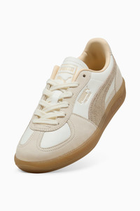 PRODUCT STORY Back in the '80s, the Palermo was a fan favorite in British soccer stadiums, instantly recognizable for its pops of color and classic gum sole. Today, the Palermo has evolved from an icon of soccer culture to a nostalgic streetwear staple, perfect for game day and every day. DETAILS - Style: 403754_01 - Color: Warm White-Chocolate Chip - Width: Regular - Toe Type: Rounded - Fastener: Laces - Heel type: Flat - Clear rubber outsole MATERIAL INFORMATION - Sockliner: 100% Synthetic - Outsole: 100% Rubber - Upper: 74.63% Leather - cow, 25.37% Synthetic - Lining: 60% Textile, 40% Synthetic