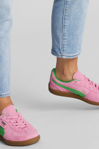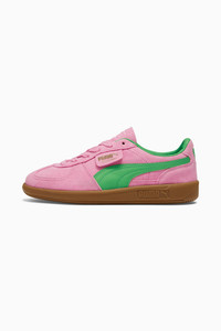 PRODUCT STORY A terrace legend from our archives returns: The Palermo. The silhouette debuted back in the early '80s, where it quickly became a staple among the terrace crowds in British soccer stadiums. Now, we’ve brought it back for the fans. Like the original, the Palermo is complete with its signature tag at the upper, a T-toe construction, colorblocking details, and, of course, the classic gum sole. FEATURES & BENEFITS - PUMA’s leather products support responsible manufacturing via the Leather Working Group.www.leatherworkinggroup.com DETAILS - Style: 397858_01 - Color: Pink Delight-PUMA Green-Gum - Leather upper - Textile sockliner - Deboss and foil printed PUMA branding on quarter panel tab and heel cap - Formstrip on lateral and medial sides - Rubber outsole MATERIAL INFORMATION - Midsole: 100% Rubber - Sockliner: 100% Textile - Outsole: 100% Rubber - Upper: 99.36% Leather - cow, 0.64% Synthetic - Lining: 100% Synthetic