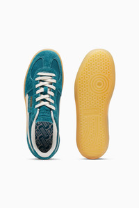 PRODUCT STORY Straight from our archives, it's the PUMA Palermo. This classic terrace shoe debuted in the 80's and now, we've brought it back for the fans. With its signature T-toe construction and classic gum sole, this version features a textile upper and suede overlays. DETAILS - Style: 396841_06 - Color: Cold Green-Frosted Ivory - Regular fit - Textile upper - Suede toe, eyestay, and heel overlays - Mesh lining; suede tongue lining - Lace closure - Rubber midsole and outsole - Suede PUMA Formstrip - PUMA branding details MATERIAL INFORMATION - Sockliner: 100% Textile - Outsole: 100% Rubber - Upper: 71.38% Leather - cow, 28.62% Textile - Lining: 100% Textile