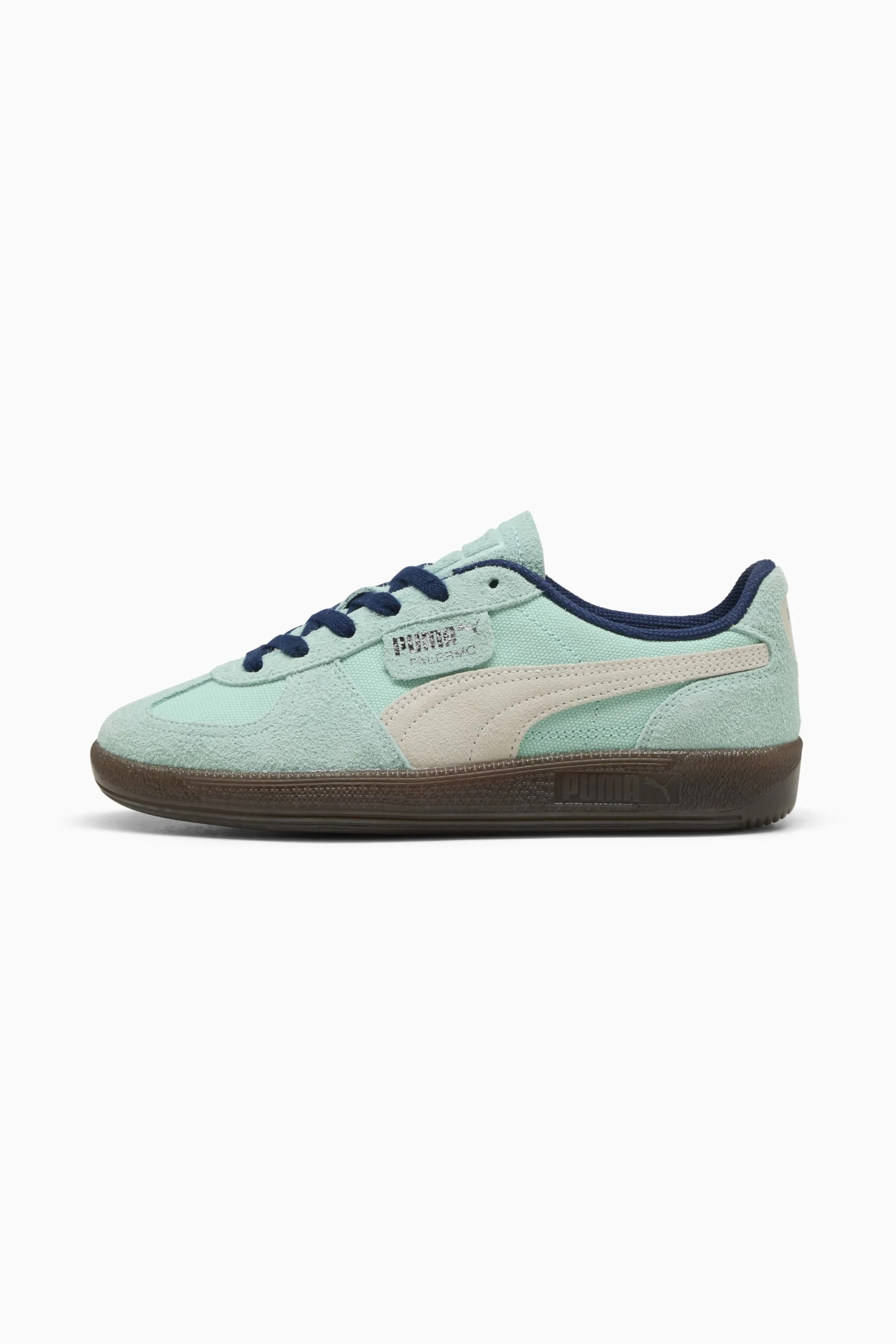 PRODUCT STORY Straight from our archives, it's the PUMA Palermo. This classic terrace shoe debuted in the 80's and now, we've brought it back for the fans. With its signature T-toe construction and classic gum sole, this version features a textile upper and suede overlays. DETAILS - Style: 400783_16 - Color: Mint Melt-Warm White - Textile base - Suede leather Formstrip - Suede leather toe and heel overlays - PUMA branding details - Mesh lining - Lace closure MATERIAL INFORMATION - Sockliner: 100% Textile - Outsole: 100% Rubber - Upper: 73.04% Leather - cow, 26.96% Textile - Lining: 100% Textile