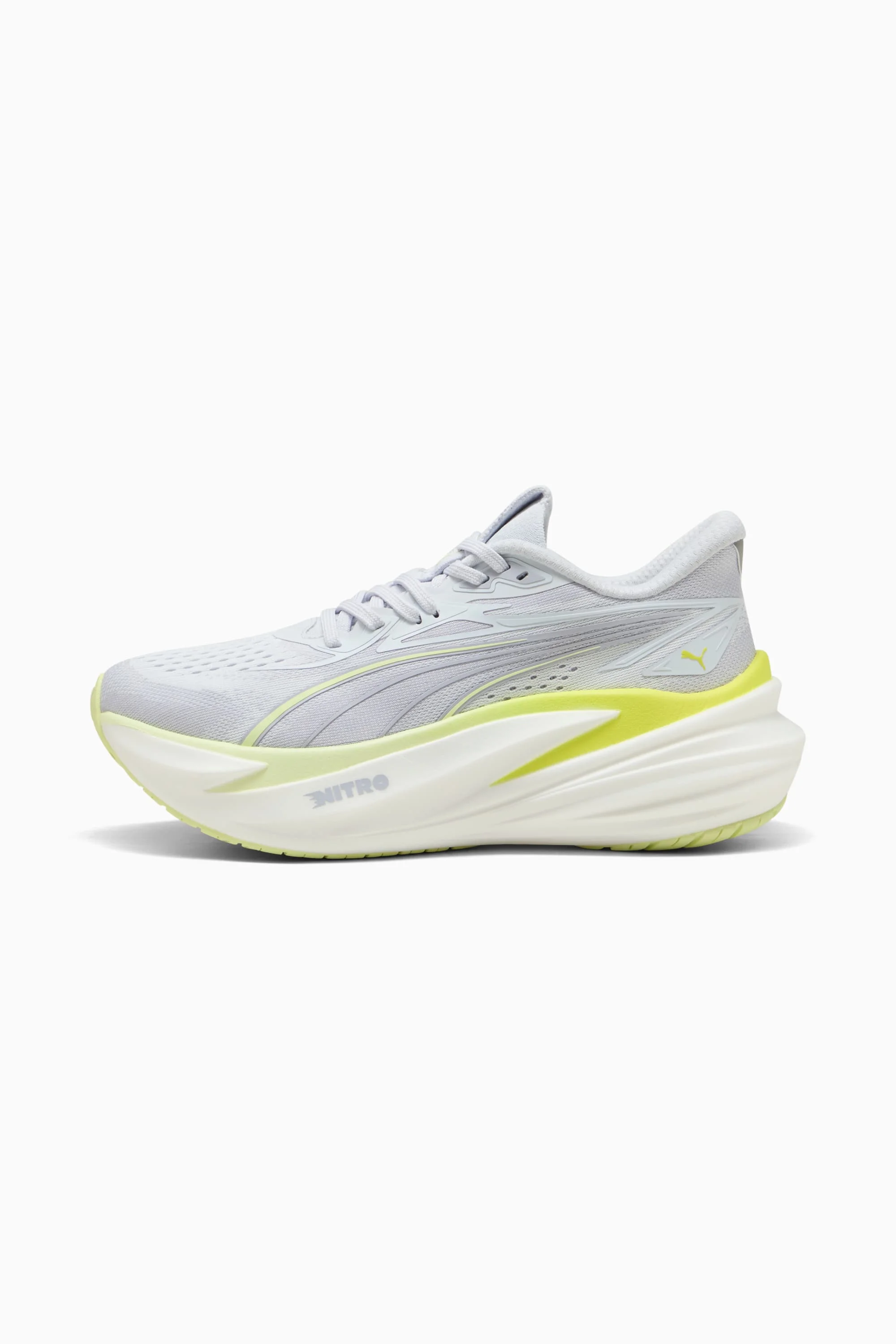 PRODUCT STORY Feel the bounce with the MagMax NITRO™ 2. Packed with the highest stack of NITROFOAM™ cushioning, it delivers an ultra-plush ride that energises every step. The engineered mesh upper keeps things cool and secure, while the PUMAGRIP outsole provides steady traction. Mile after mile, these shoes bring effortless comfort and performance. FEATURES & BENEFITS - The upper of the shoes is made with at least 30% recycled materials. DETAILS - Style: 312126_03 - Color: Silver Mist-Apple Spritz - Width: Regular - Toe Type: Rounded - Fastener: Laces - Heel type: Flat - Stack Height: 46mm / 38mm - Cushioning: Max - Heel-to-toe drop: 8mm - Pronation: Overpronation - Weight: 275g (UK8) MATERIAL INFORMATION - Sockliner: 100% Textile - Outsole: 100% Rubber - Upper: 70.42% Textile, 29.58% Synthetic - Lining: 100% Textile