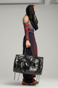 PRODUCT STORY Luxe-streetwear brand Aries is back with a new collection that combines their signature extravagance with PUMA’s heritage silhouettes. This collection is centered around the charged athleticism of Muay Thai as well as the danger and thrill of classic fighting games DETAILS - Style: 091211_01 - Color: PUMA Black - Zip opening into main compartment - Two big side pockets with metal zip pullers and real leather tassles - Large zipped front pocket with storm flap - Hanging zip pocket inside - Chunky metal carabine with ARIES ARISE Logo print and additional luggage tag - Dimensions: W50cm / D26cm / H32cm - Volume: 23.5L - PUMA branding details MATERIAL INFORMATION - Lining: 100% polyester - Trimming: 100% full grain cow leather - Shell: 100% polyester