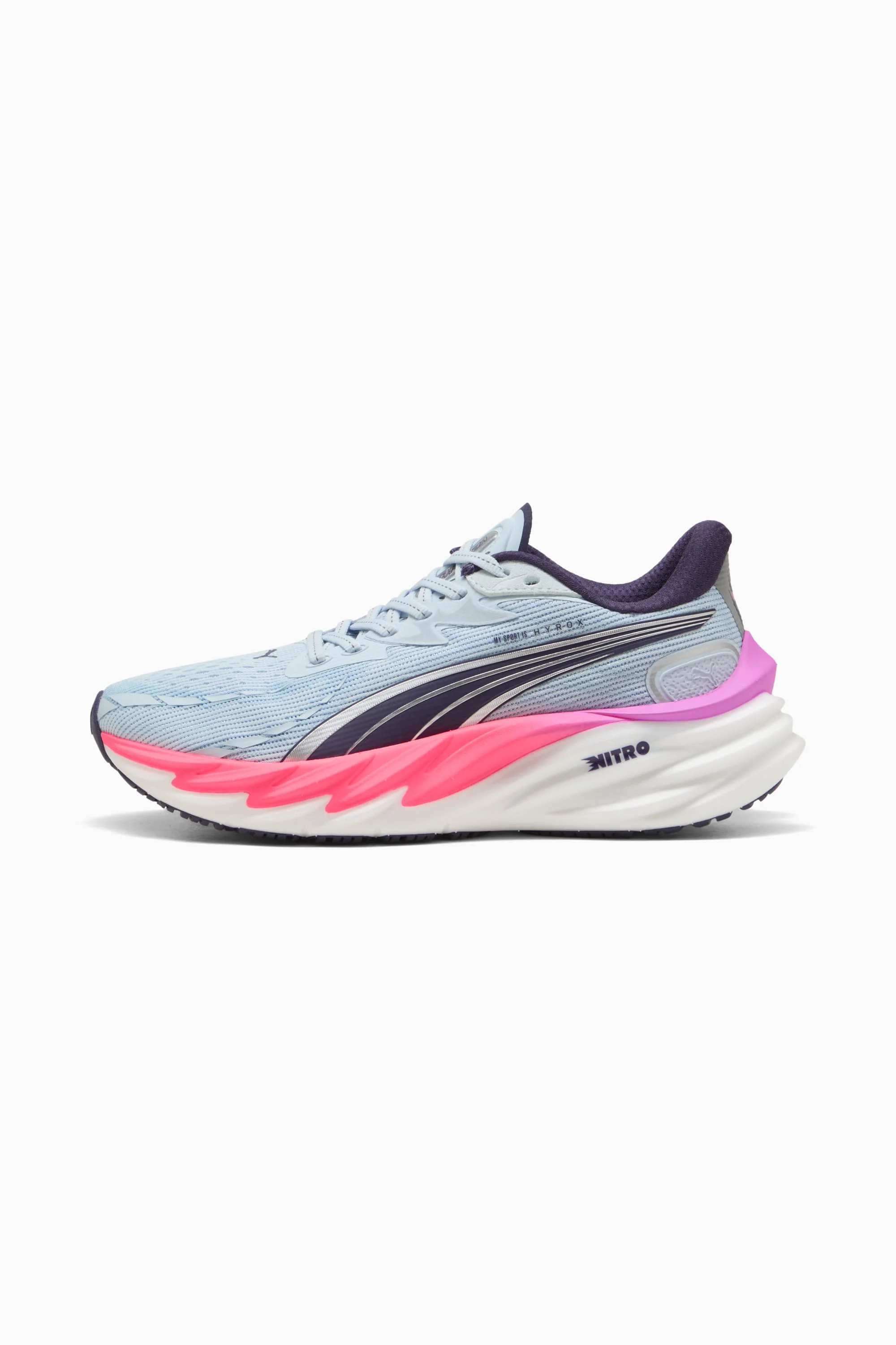 PRODUCT STORY The PUMA x HYROX Velocity NITRO™ 4 running shoe is built to handle the full demands of hybrid fitness racing. Designed for versatility, it delivers a smooth, cushioned ride through runs, reps, and everything in between. From first-time HYROX athletes to seasoned competitors, this shoe brings together comfort, responsiveness, and race-ready durability. FEATURES & BENEFITS - NITROFOAM™: New innovative nitrogen-infused foam technology compound that uses premium raw materials to provide high rebound and a lightweight ride - PUMAGRIP: Durable performance rubber compound designed for all-surface traction - The upper of the shoes is made with at least 30% recycled materials. DETAILS - Style: 312916_01 - Color: Lucite-Pure Pink-Deep Plum - Width: Regular - Toe type: Rounded - Fastener: Laces - Heel type: Flat - Cushioning: Medium - Heel-to-toe drop: 10mm - Pronation: Neutral MATERIAL INFORMATION - Sockliner: 100% Textile - Outsole: 100% Rubber - Upper: 69.33% Textile, 27.81% Synthetic, 2.86% Leather - cow - Lining: 100% Textile