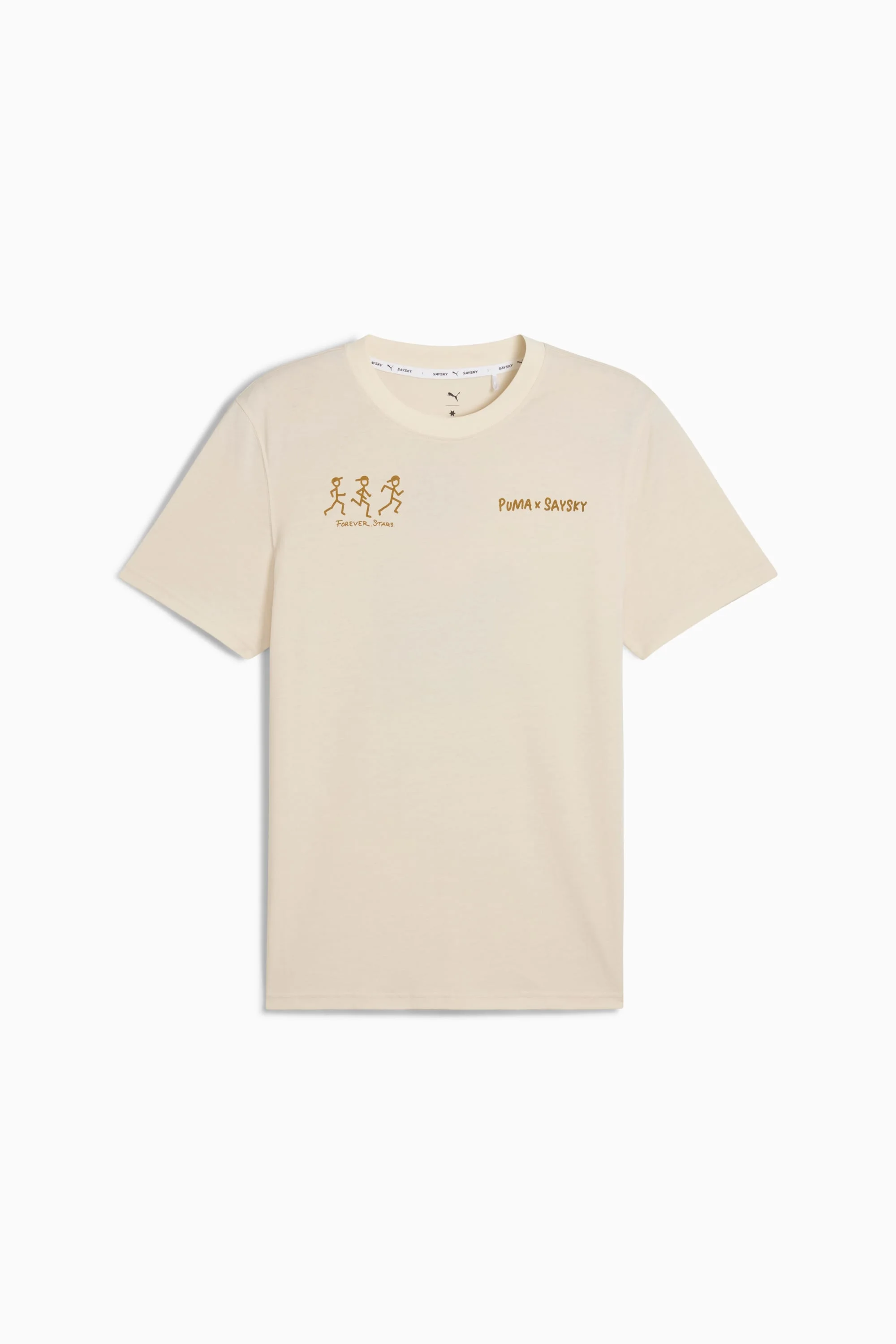 PRODUCT STORY Race day is about more than just the run – it’s a celebration of community, culture, and shared energy. Whether you’re chasing a PR or cheering from the sidelines, the latest PUMA x SAYSKY collection captures the spirit of the sport. Rooted in unity, the collection’s bold, sharp silhouettes capture the discipline and power of the pack - designed to make runners feel unstoppable, together. Collection pieces blend SAYSKY’s bold design language with PUMA’s cutting-edge running technology. The capsule also includes travel-ready essentials made for getting to and from the course. From race to recovery, it’s everything you need to tackle a race weekend in style. FEATURES & BENEFITS - Made with at least 50% recycled materials - MOISTURE MANAGEMENT: Technical dryCELL fabrics wick moisture away from the skin to help keep you dry and comfortable DETAILS - Style: 528147_87 - Color: Alpine Snow - Regular fit - Crew Neck - Short sleeves - PUMA x SAYSKY graphic on the back - Co-branding details MATERIAL INFORMATION - Shell: 50% polyester, 25% cotton, 25% viscose